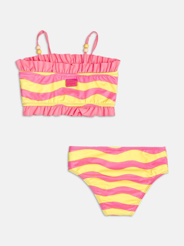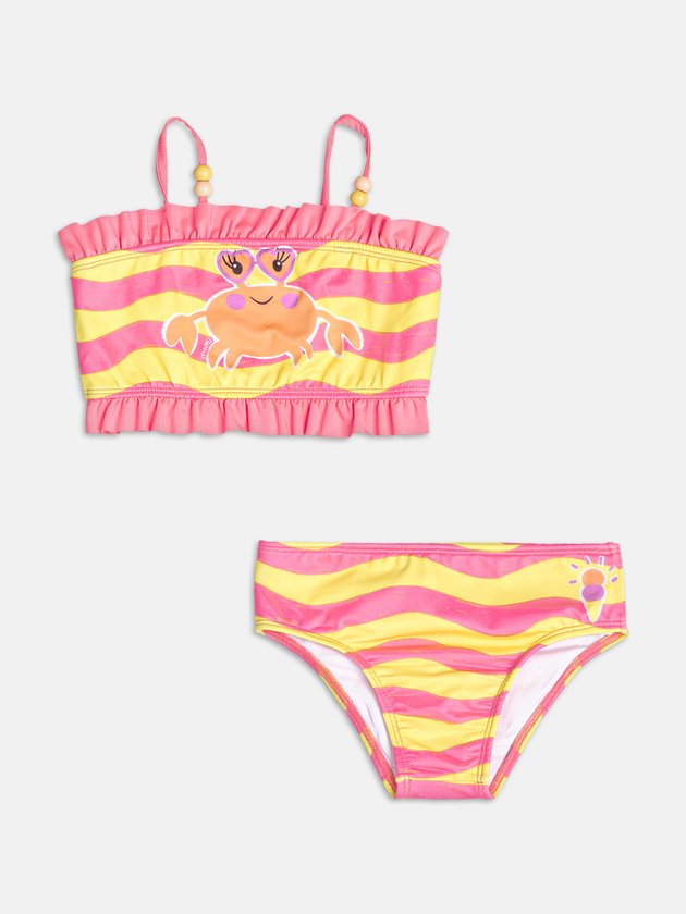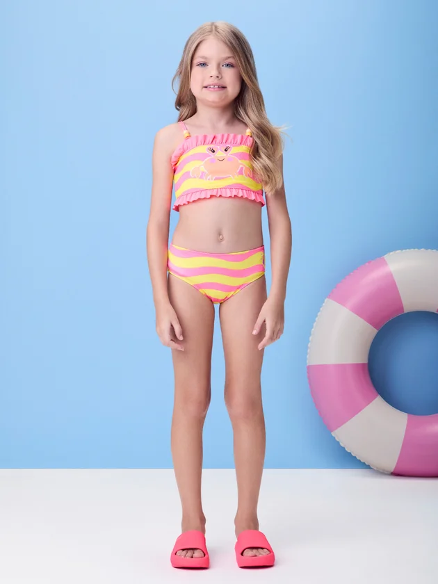Perfeito para os dias de praia, esse biquíni é pura diversão! A estampa de siri e os babadinhos delicados criam uma proposta lúdica e alegre. O top com alcinhas finas e a calcinha ajustável garantem conforto para brincar à vontade. Uma peça cheia de personalidade que traduz a essência solar da coleção com toque divertido e tropical.