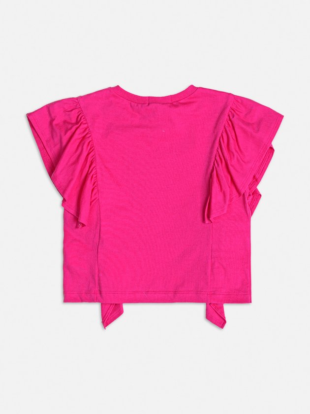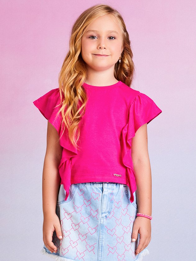 A blusa rosa infantil Momi é confeccionada em meia malha, proporcionando conforto para as meninas. Seus babados charmosos frente e costas adicionam um toque de delicadeza ao visual. Uma peça prática e versátil, ideal para compor vários looks. Composição: 100% algodão. Ref.: H4648