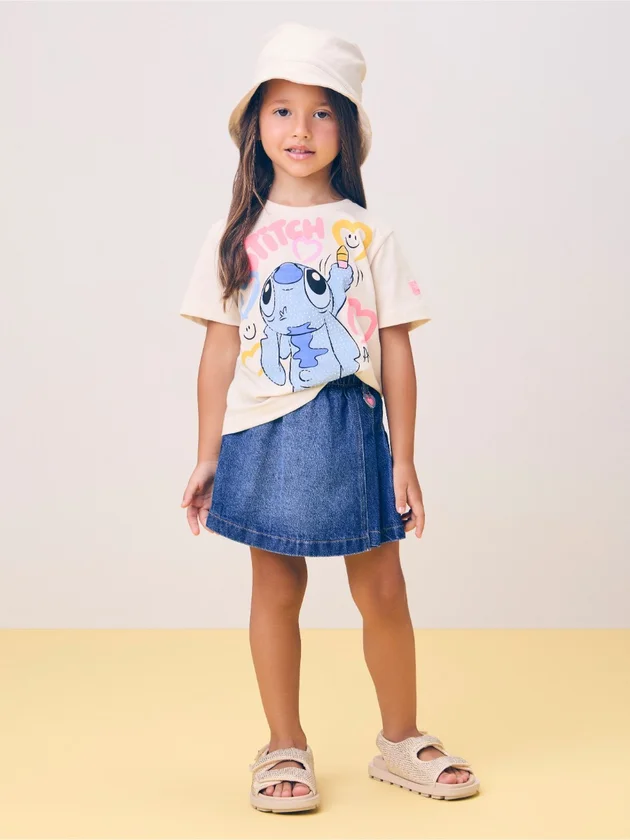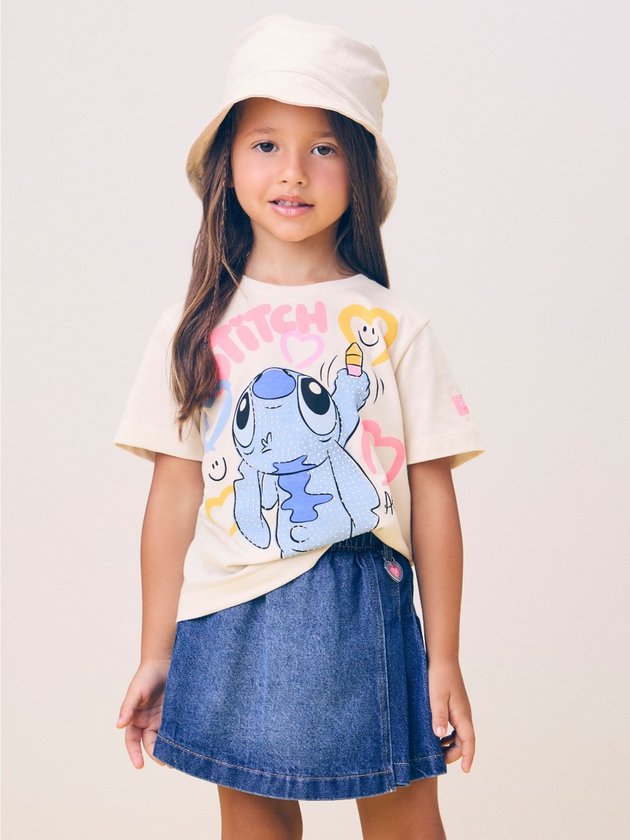 A blusa perfeita para as pequenas que amam o universo do Stitch! Com fundo off white, a peça ganha destaque com a estampa do personagem em clima de férias, acompanhada da palavra "Aloha" em lettering divertido. Além disso, a modelagem soltinha e o tecido leve garantem conforto absoluto. Uma peça versátil, que combina facilmente com shorts, saias ou calças, ideal para deixar qualquer look mais alegre, moderno e descontraído.
