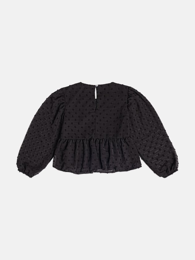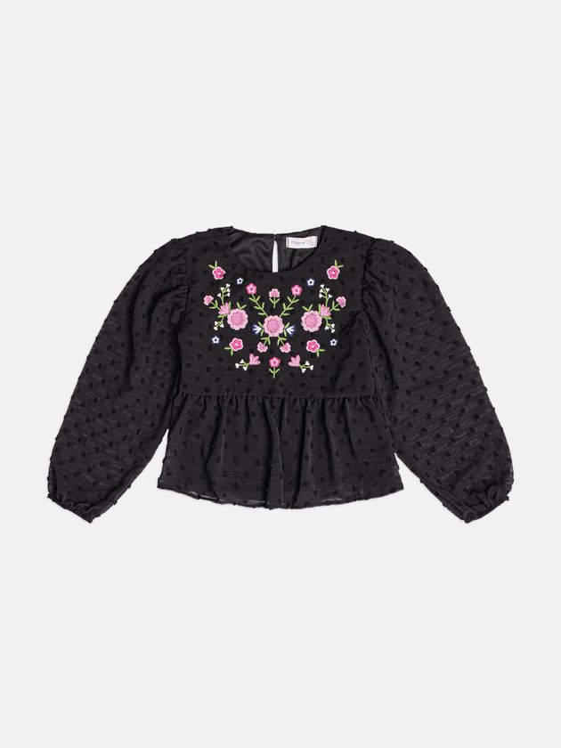 A blusa infantil preta de manga bufante com bordado é puro charme para quem ama um visual delicado, mas com presença. Feita em tecido leve com textura poá, ela tem manga bufante que traz volume na medida certa e um caimento confortável. O bordado frontal com flores em tons de rosa e verde cria um contraste lindo com o preto, deixando a peça super feminina e elegante. A barra levemente rodada traz movimento e dá aquele toque romântico ao look. Versátil e sofisticada, combina com jeans, saias ou peças mais arrumadinhas para momentos especiais. Ref.: H6939