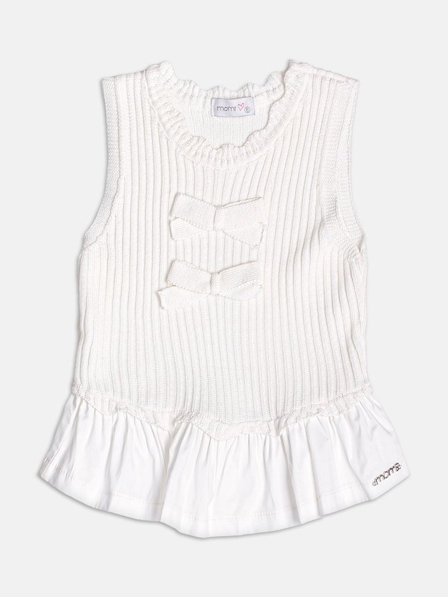 Essa blusa off white em tricot leve conquista pelos laços aplicados no centro, que trazem um charme clássico ao visual. O tricot tem textura delicada, com babado adicionado na barra, peça ideal para compor looks elegantes nos dias amenos do verão. Pode ser usada com saias românticas ou shorts descontraídos, equilibrando o estilo com sofisticação. Uma peça versátil e encantadora, perfeita para o guarda-roupa das pequenas fashionistas. Ref.: H6649