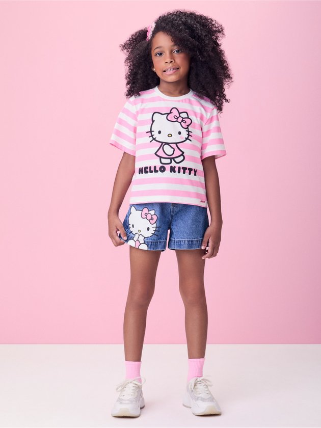 Essa blusa traz a doçura do verão em cada detalhe, com listras em rosa suave e a Hello Kitty estampada em versão charmosa. A peça une conforto e estilo, com modelagem soltinha e tecido leve ideal para os dias de sol. O desenho delicado da personagem conversa com os tons da peça, criando uma composição harmoniosa. Fácil de combinar com shorts, saias ou jeans da coleção. Uma peça versátil para compor looks fofos e descontraídos.