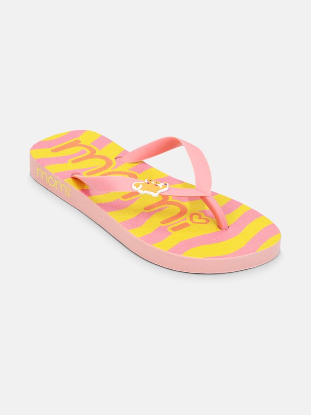 O chinelo flip mais fofo do verão! Com estampa vibrante em rosa e amarelo, traz a logo Momi e um aplique de caranguejo que deixa tudo mais divertido. Além de leve e confortável, é feito com matéria-prima 100% reciclável, vegana, hipoalergênica e não tóxica. Um modelo perfeito para curtir os dias de sol com muito estilo! Ref.: AH001