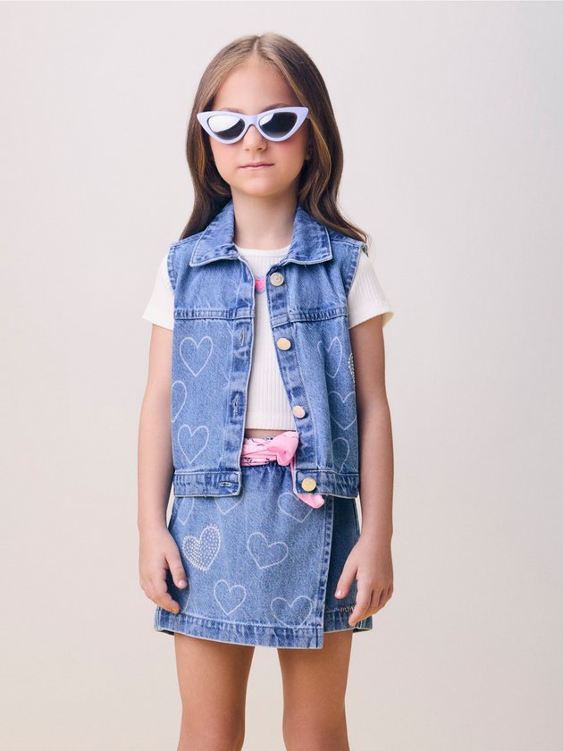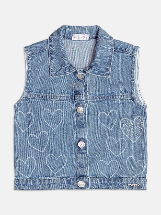 O básico nada básico! O colete jeans ganha charme com aplicação de corações bordados e detalhes em strass, que adicionam brilho na medida certa. Com modelagem moderna e corte estruturado, é a peça perfeita para sobrepor vestidos, blusas e t-shirts, trazendo um toque fashion para qualquer look.