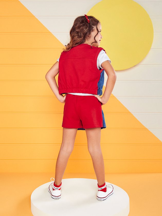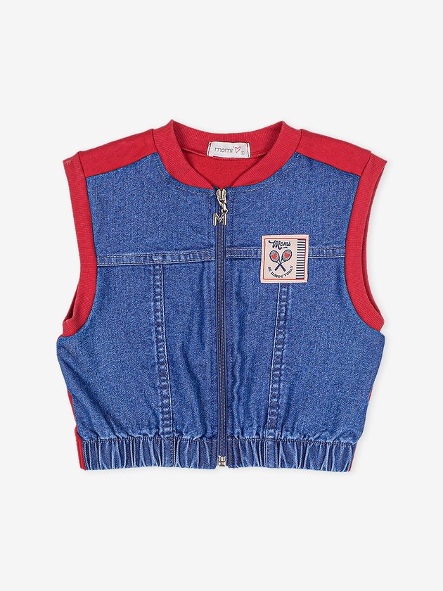 Colete infantil Momi foi confeccionado com parte da frente em jeans e costas feita em moletom. Possui fechamento frontal com zíper personalizado que deixa a peça ainda mais charmosa e conta também com aplicação de etiqueta decorativa. Composição - Frente: 82% algodão, 16% poliéster e 2% elastano; Costas: 100% algodão. Ref.: H3852