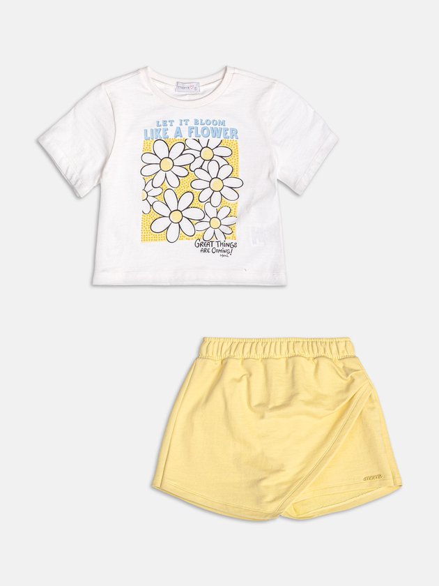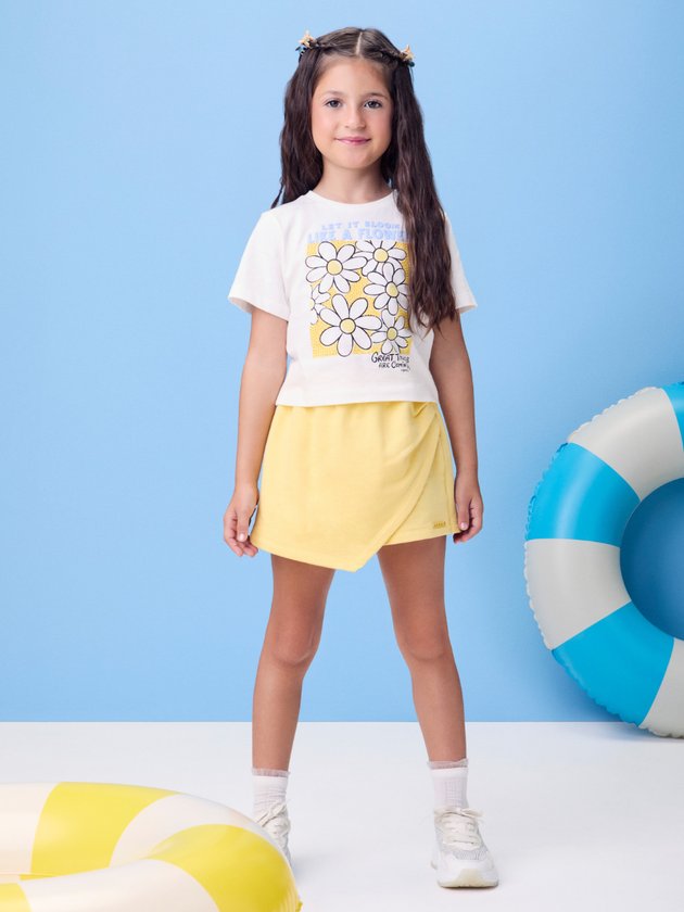 Radiante como um dia ensolarado, o conjunto amarelo é decorado com flores em cores vibrantes e pontos de strass que brilham na medida certa. A combinação entre o tom cítrico e os elementos lúdicos cria um visual encantador, perfeito para um verão cheio de descobertas.
