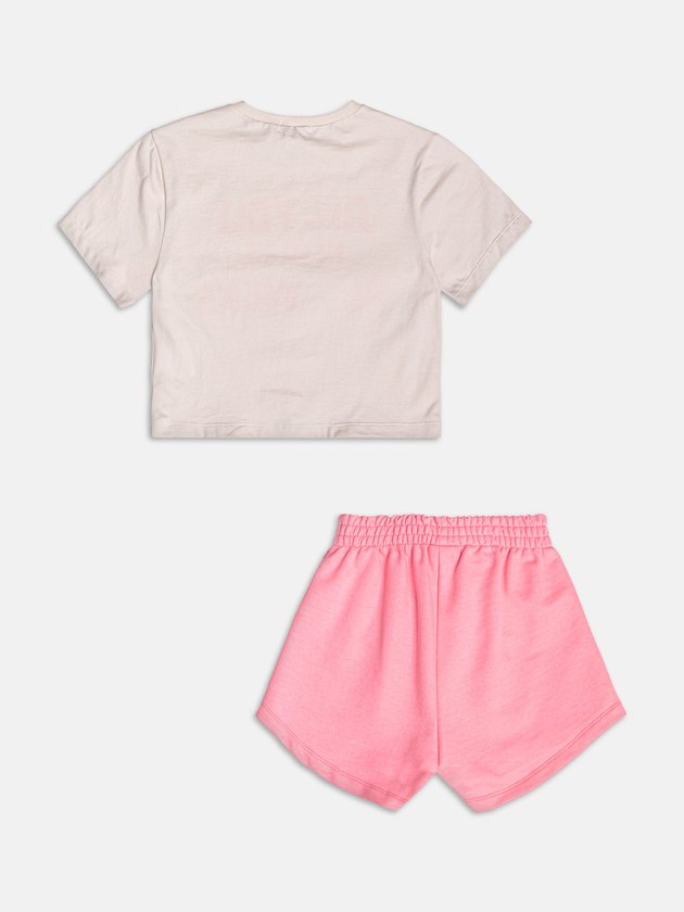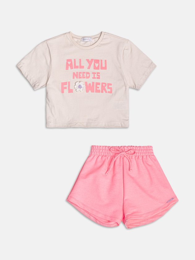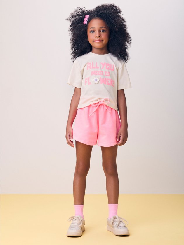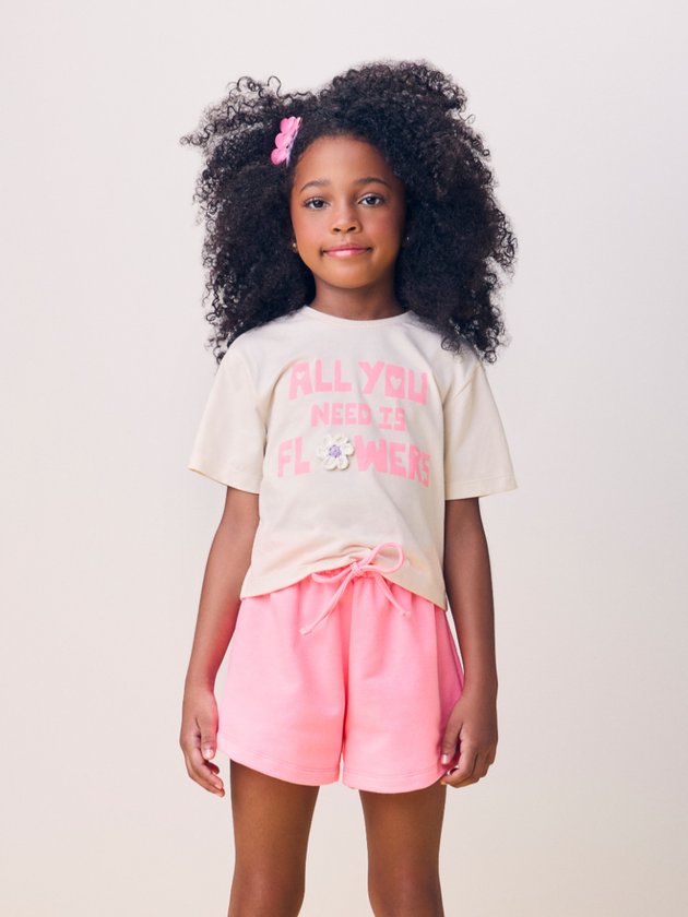 Cheio de charme e detalhes especiais! A blusa traz aplique de florzinhas em crochê, com acabamento delicado e laço aplicado no centro, que adiciona um toque artesanal e encantador. O short em tom coordenado complementa o visual com muito conforto e estilo.