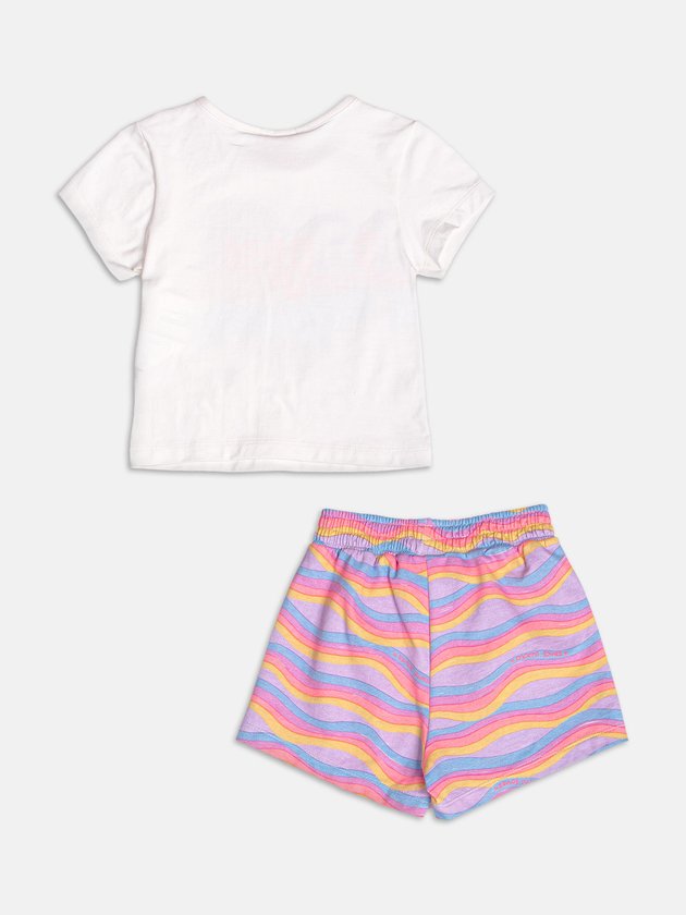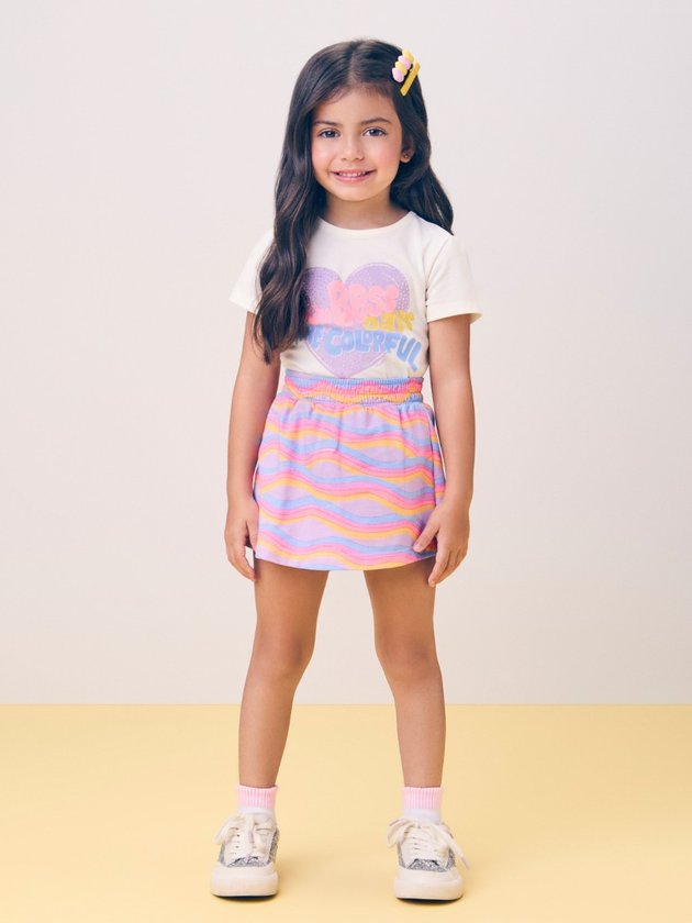 Um conjunto vibrante que celebra a alegria das cores! A camiseta off white traz a frase "The Best Days Are Colorful" com aplicação de strass no coração lilás, adicionando um brilho especial ao visual. Acompanha um short-saia com estampa arco-íris em tons pastel, que confere movimento e um charme extra ao look. Ideal para meninas que amam se expressar com leveza e diversão.