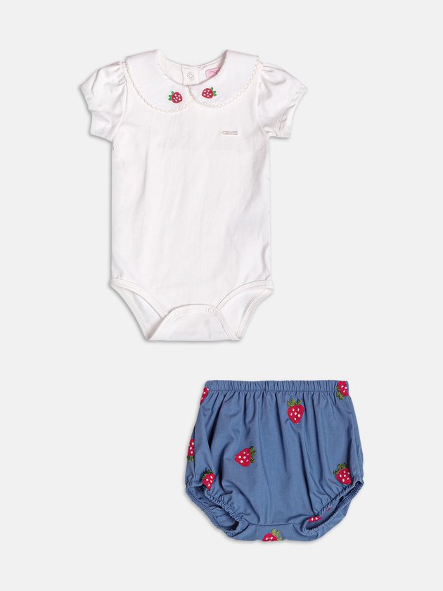 Delicado e encantador, esse conjunto azul traz bordado de morangos que adiciona um toque frutado ao visual. O body tem mangas curtas e detalhe de botão nas costas, enquanto o short acompanha com caimento leve e cós com elástico. Um look fresco e romântico que une conforto com detalhes encantadores. Perfeito para dias leves de verão. Ref.: C2648