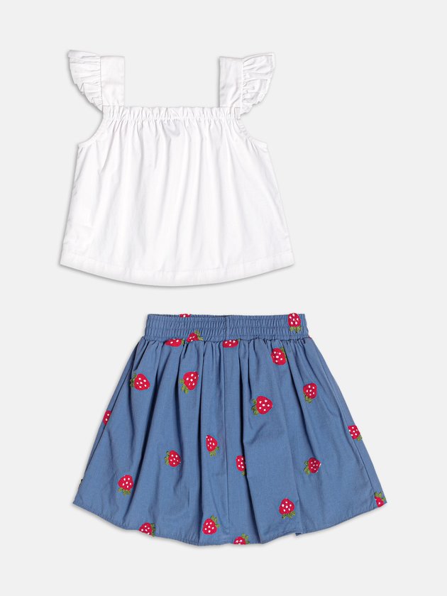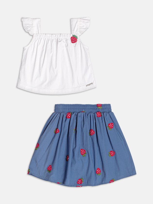 Com estética doce e divertida, esse conjunto azul traz patch de morangos bordados que adicionam vida ao look. A blusa tem corte soltinho e a saia acompanha com modelagem evasê, ideal para aproveitar os dias com liberdade. Um conjunto encantador, perfeito para as pequenas que adoram cores suaves e detalhes especiais.