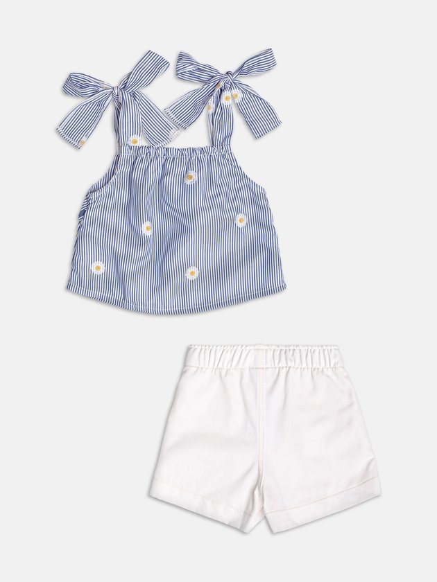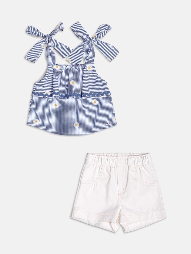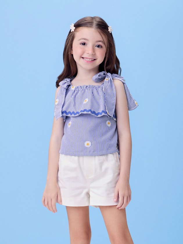 Com inspiração navy e toque romântico, esse conjunto azul listrado conquista pelos laços aplicados nas alças, que adicionam feminilidade ao visual. A blusa traz modelagem leve e soltinha, e o short coordenado completa o look com conforto e praticidade. As listras dão um ar clássico, enquanto as florzinhas suavizam com graça. Um visual que une tradição e doçura, perfeito para os dias ensolarados da estação.