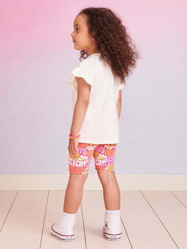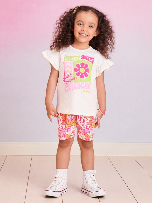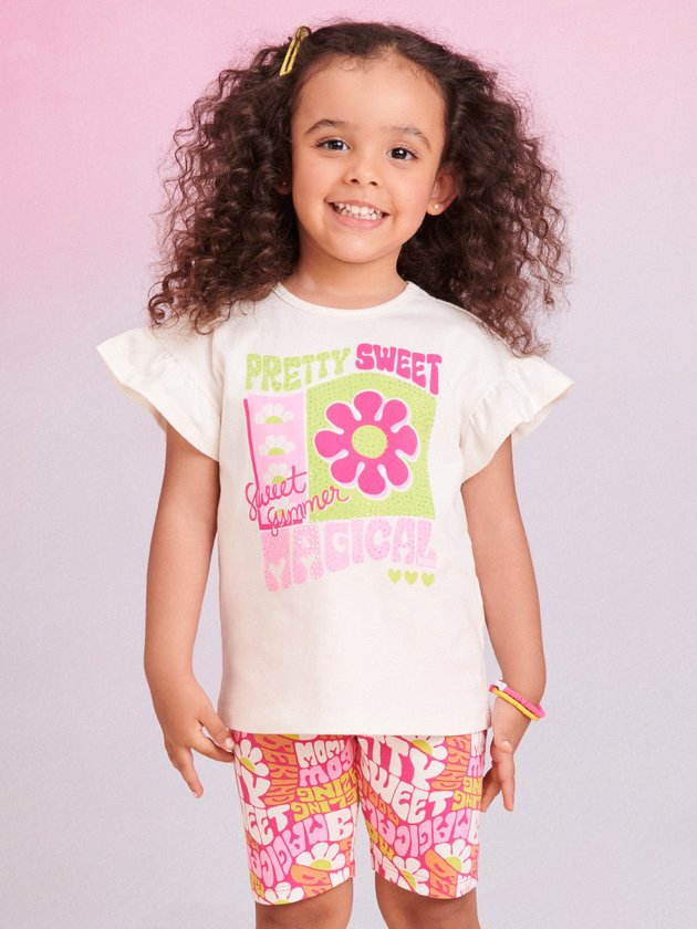 O conjunto infantil Momi é confeccionado em cotton, proporcionando conforto às meninas. A blusa possui aplicação de strass na estampa, adicionando um toque de brilho. A legging estilo biker possui elástico na cintura, garantindo praticidade no vestir. Um conjunto confortável e prático, perfeito para o dia a dia delas. Composição: 96% algodão e 4% elastano. Ref.: J5452