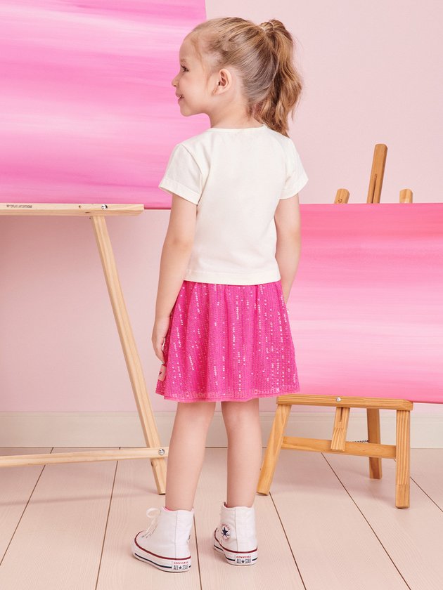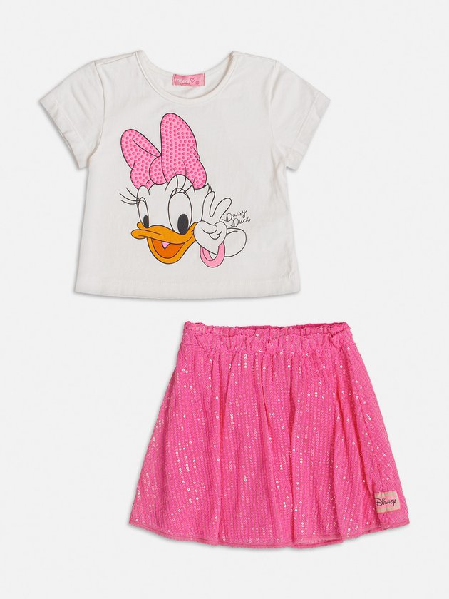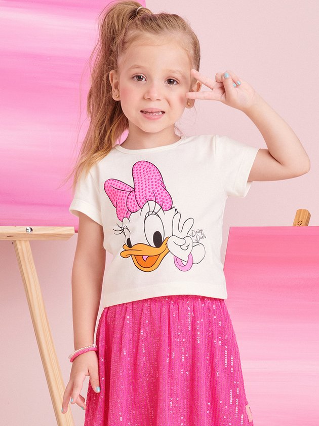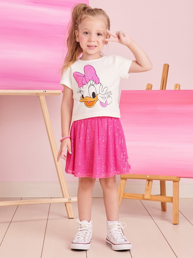 O conjunto infantil Momi é uma combinação encantadora com estampa licenciada Disney da Daisy. A blusa, feita em cotton, possui detalhes em strass que adicionam brilho ao visual e a saia de paetê é confortável, com elástico no cós. Completo com uma etiqueta decorativa e forro em short, as meninas vão amar esse conjunto cheio de estilo e diversão. Composição - Blusa: 85% algodão no mínimo. Saia: 97% poliéster e 3% elastano. Forro: 96% poliéster e 4% elastano. Ref.: J5444