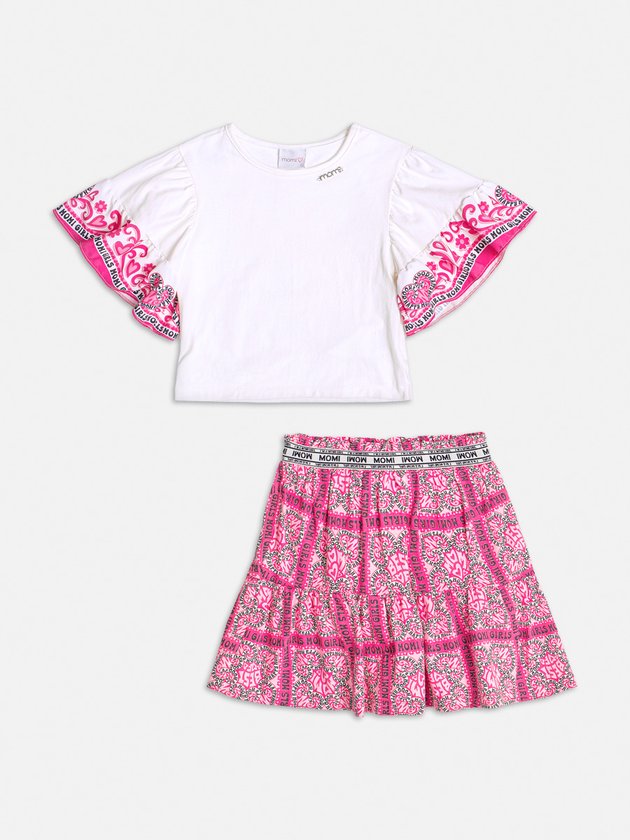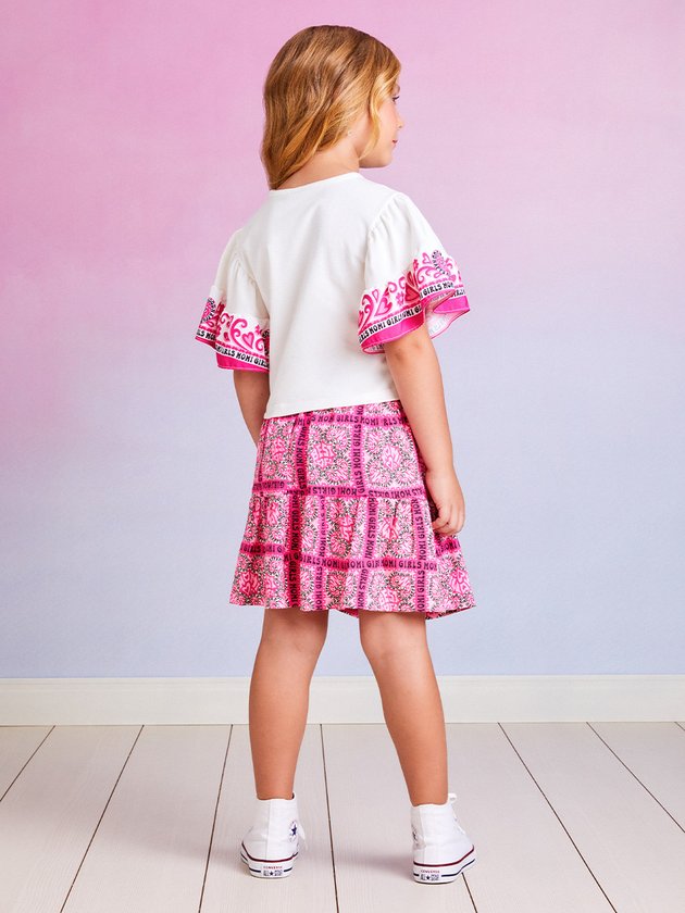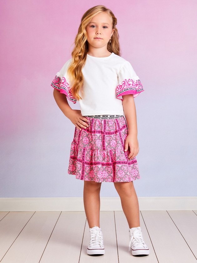 O conjunto infantil Momi é uma opção encantadora para as meninas. A blusa é confeccionada em cotton e a saia, feita em meia malha, possuem estampa charmosa na cor rosa. O cós conta com elástico personalizado, proporcionando ajuste perfeito. Além disso, a saia possui forro em short, garantindo maior conforto durante o uso. Composição - Blusa: 96% algodão e 4% elastano. Saia: 100% algodão. Ref.: H4885