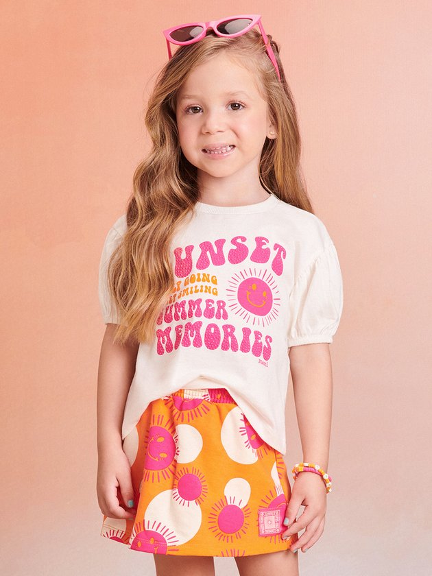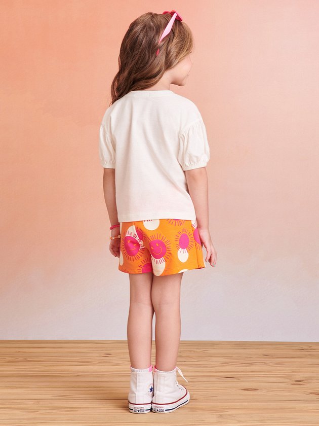 Apresentamos o conjunto infantil Momi em tom laranja, composto por blusa em meia malha com aplicação de strass e mangas bufantes, adicionando charme. O short saia de moletom, com elástico na cintura, combina conforto e estilo. Ideal para meninas que valorizam praticidade e elegância no dia a dia. Composição: 100% algodão. Ref.: J5347