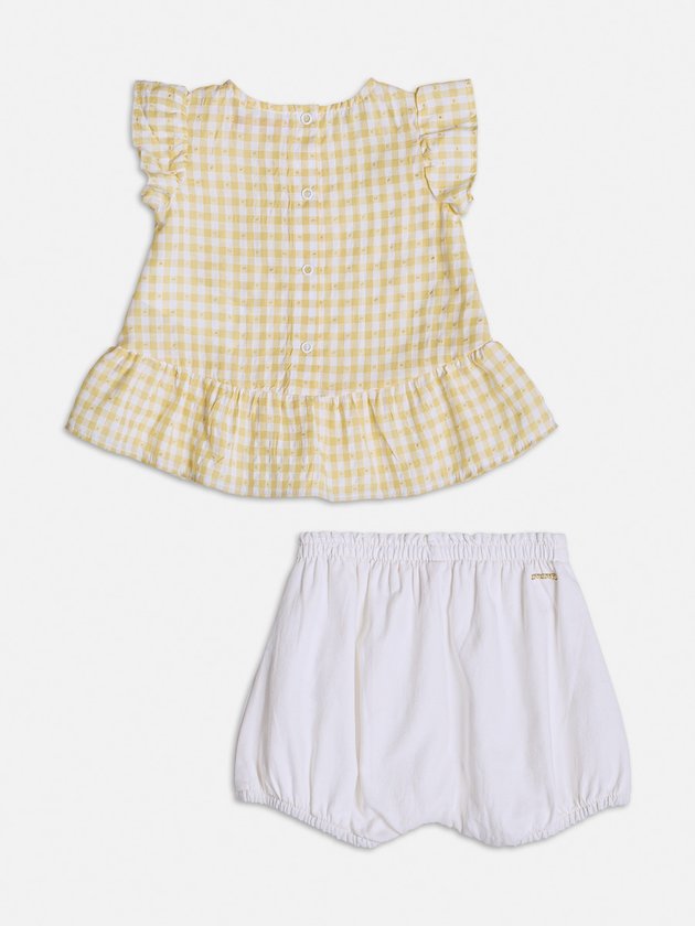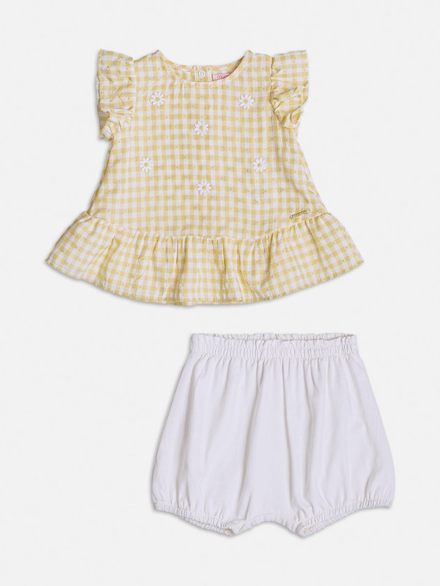 Deixe as babys ainda mais estilosas nesse verão! O conjunto vichy amarelo com branco da Momi é composto por bata e um short, é perfeito para um visual fashion e fresquinho. Possui elástico no cós para maior conforto. Ele se destaca com o encantador patch de margaridas na parte de cima. Um conjunto versátil e cheio de charme para os dias ensolarados! Composição - Blusa: 52% viscose e 48% poliéster. Short: 100% algodão. Ref.: C1951