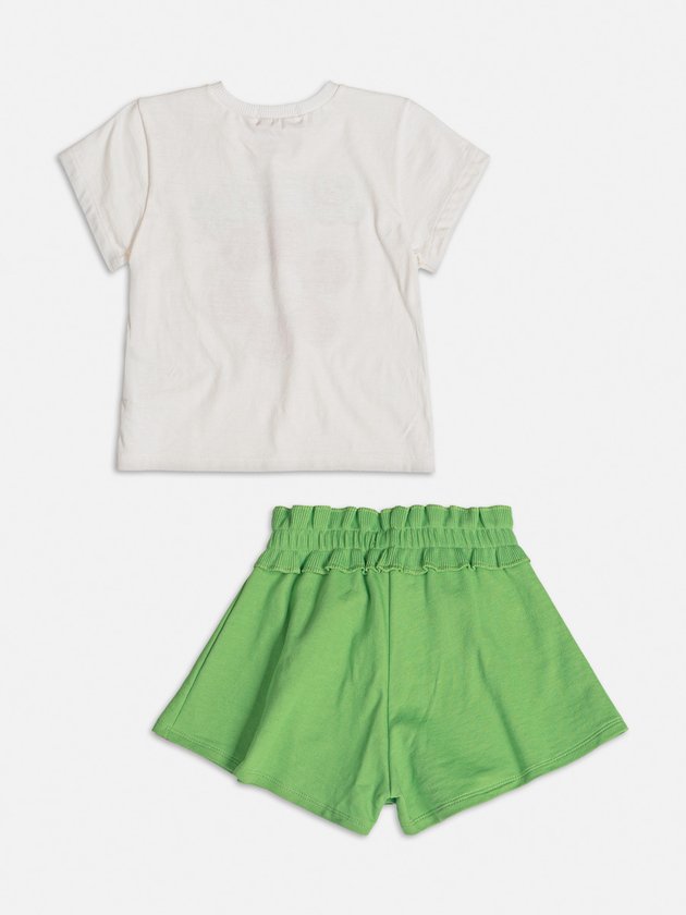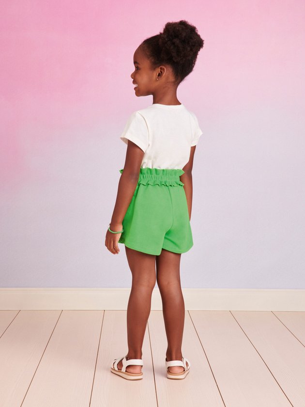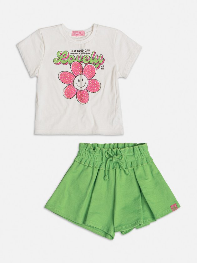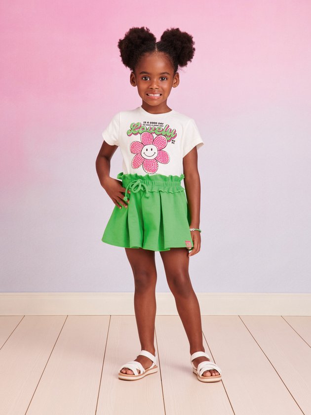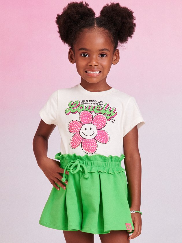 O conjunto infantil Momi é composto por blusa confeccionada em meia malha com estampa divertida com strass, acrescentando um toque de brilho e estilo. O short, feito em moletom verde com cós em ribana oferece um ajuste confortável, enquanto o cadarço decorativo na cintura adiciona um charme extra à peça. Ideal para as meninas que buscam um visual mais charmoso. Composição: 100% algodão. Ref.: J5798