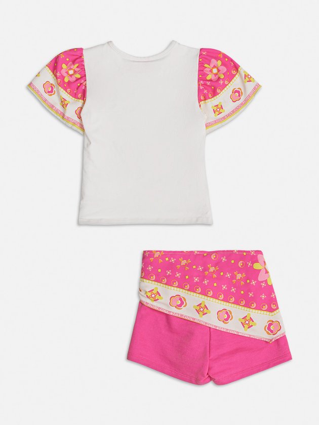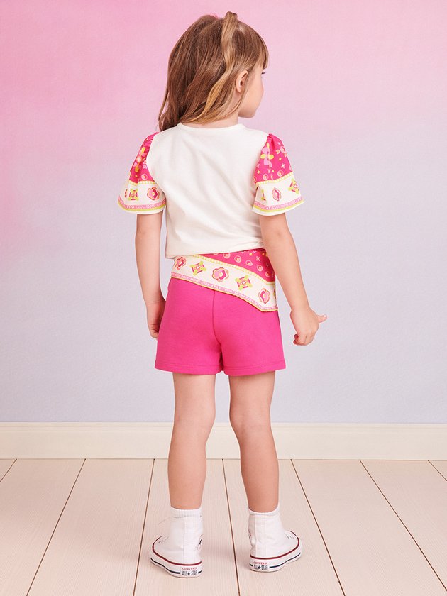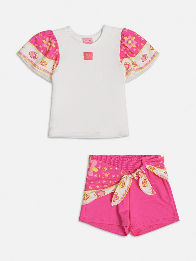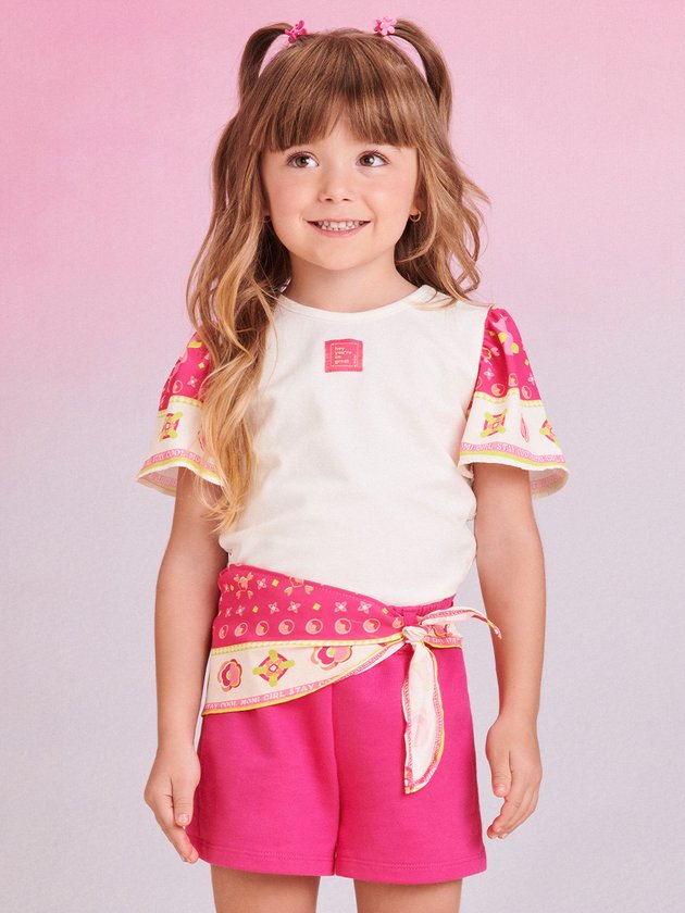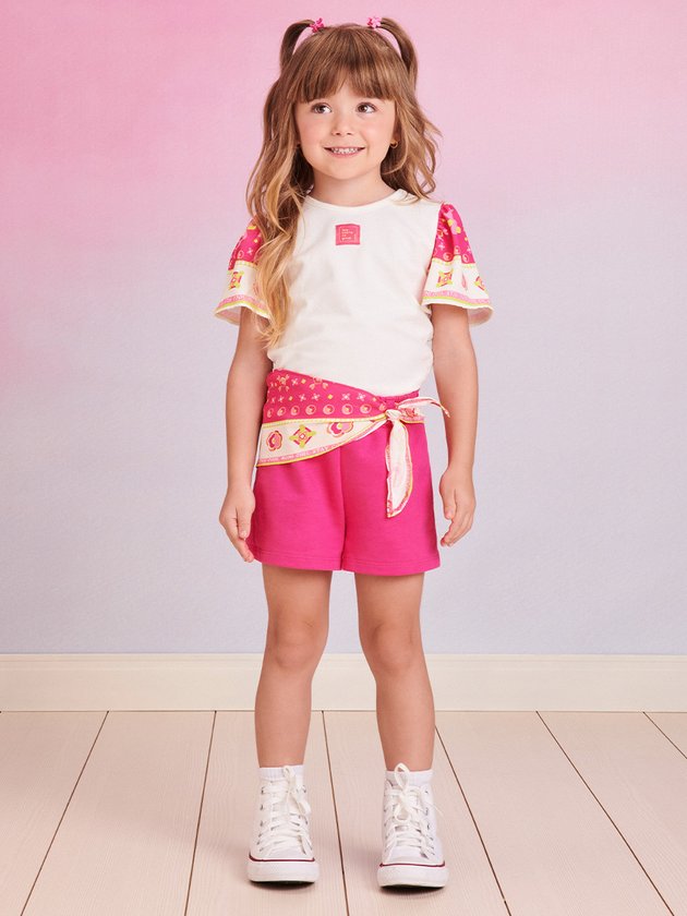O conjunto infantil Momi apresenta blusa confeccionada em cotton e um short em moletom, ambos proporcionando conforto às meninas. O short possui elástico no cós para um ajuste perfeito. O look é complementado com detalhes em lenço, adicionando um toque delicado. Uma opção encantadora e charmosa para as pequenas fashionistas. Composição - Blusa: 96% algodão e 4% elastano. Short: 100% algodão. Ref.: J5810