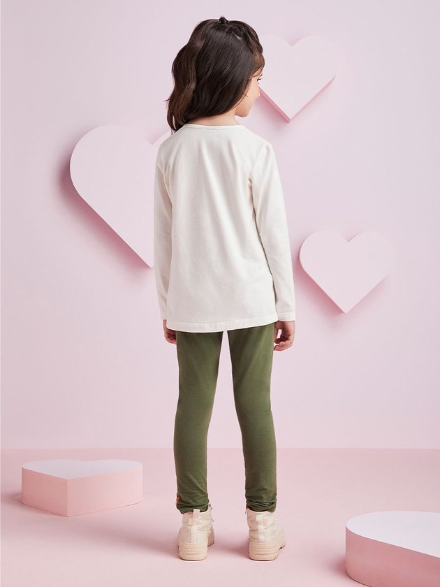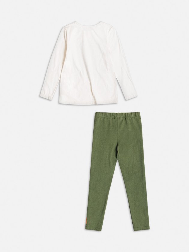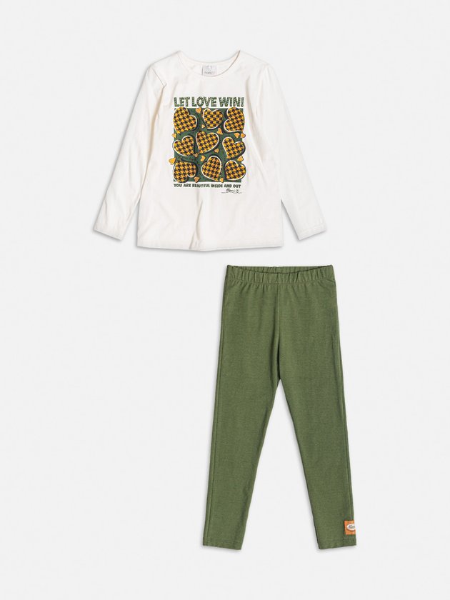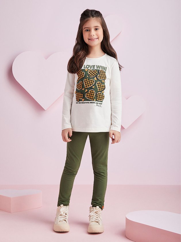 O conjunto estampado é puro charme e fashionismo! A blusa com manga longa Momi é confeccionado em cotton e é desenvolvido na cor off white com estampa de corações. A calça justa possui uma cor verde musgo, com elástico no cós. É impossível não se apaixonar! Composição: 96% algodão e 4% elastano. Ref.: H5353