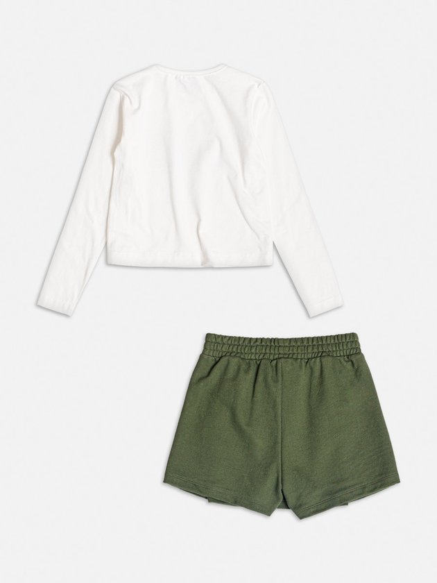 O conjunto de Moletom Momi é puro charme e fashionismo! A blusa manga longa é confeccionada em algodão e é desenvolvido na cor off white com estampa em lettering. O short saia traz modelagem básica na cor verde militar. É impossível não se apaixonar. Composição: Blusa: 96% algodão, 4% elastano. Short Saia: 100% algodão. Ref.: H5380