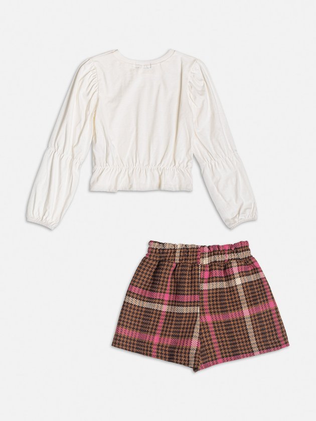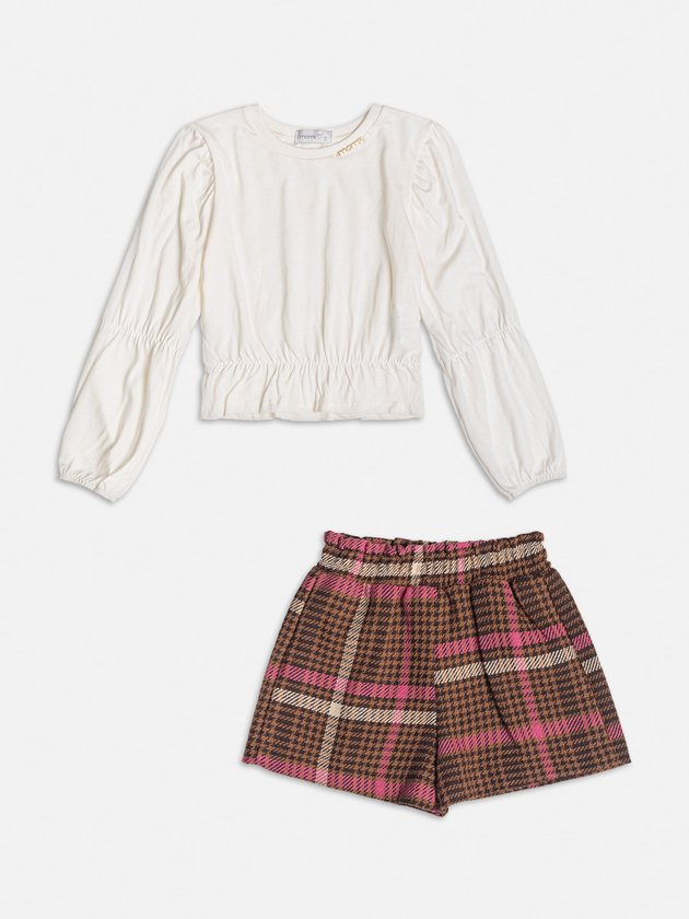 O conjunto infantil Momi é um charme para as pequenas fashionistas. A blusa em meia malha apresenta mangas bufantes, adicionando um toque fofo. O short em tweed traz sofisticação delicadeza, com elástico no cós para maior conforto. Este conjunto é a combinação perfeita de estilo e praticidade para as meninas. Composição - Blusa: 100% algodão. Short: 56% poliéster, 23% acrílico, 5% lã, 4% poliamida, 4% algodão, 4% viscose e 4% liocel. Ref.: H5383
