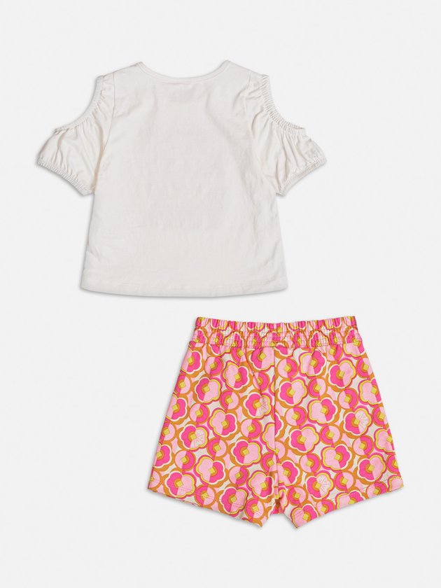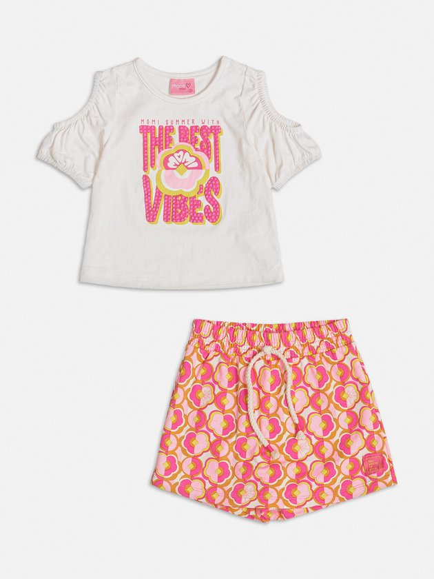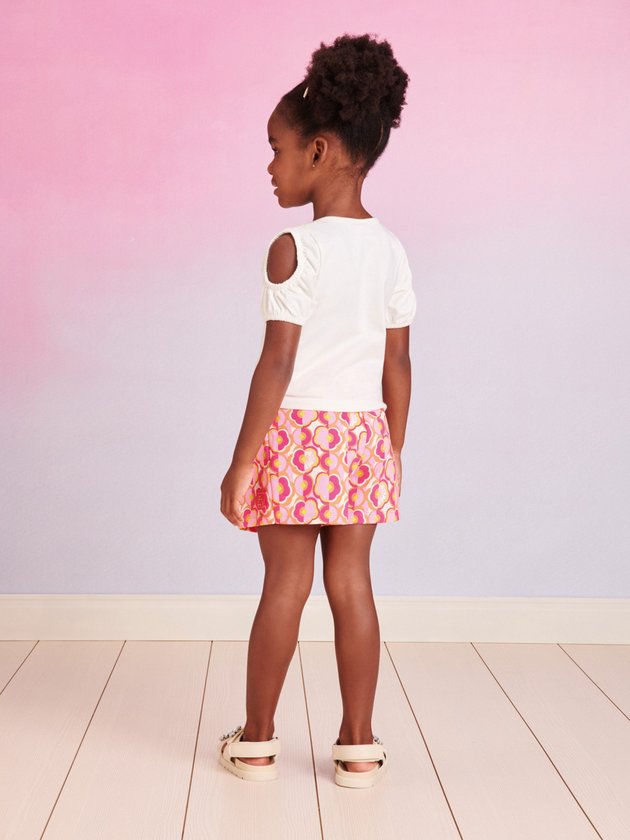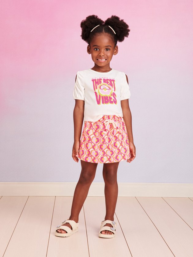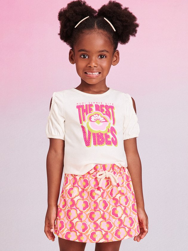 O conjunto Momi é composto por blusa de cotton com mangas bufantes e abertura ajustada por elástico, proporcionando um charme especial. O short saia, feito em moletinho, possui cintura com elástico para garantir conforto durante o uso. Esse conjunto é perfeito para as meninas que desejam um look meigo e cheio de estilo. Composição - Blusa: 96% algodão e 4% elastano. Short saia: 100% algodão. Ref.: J5353
