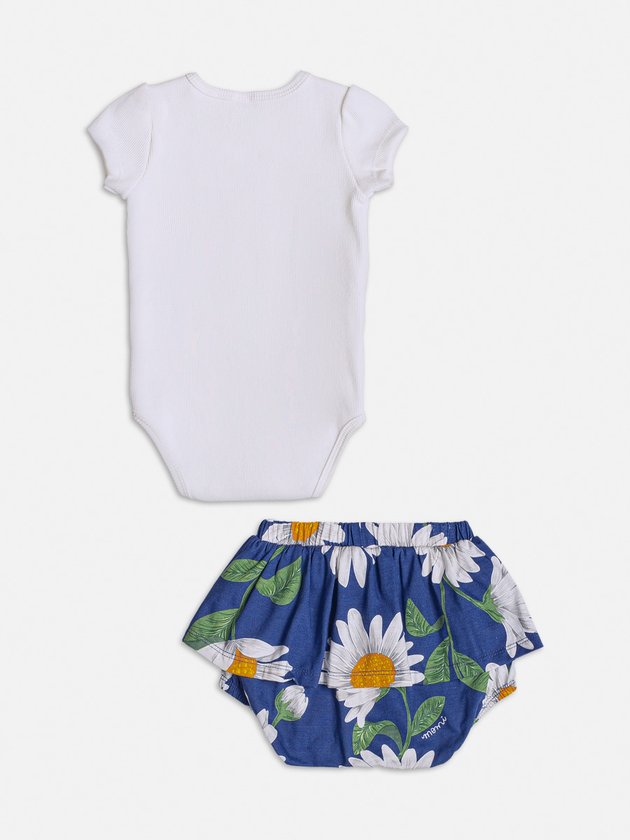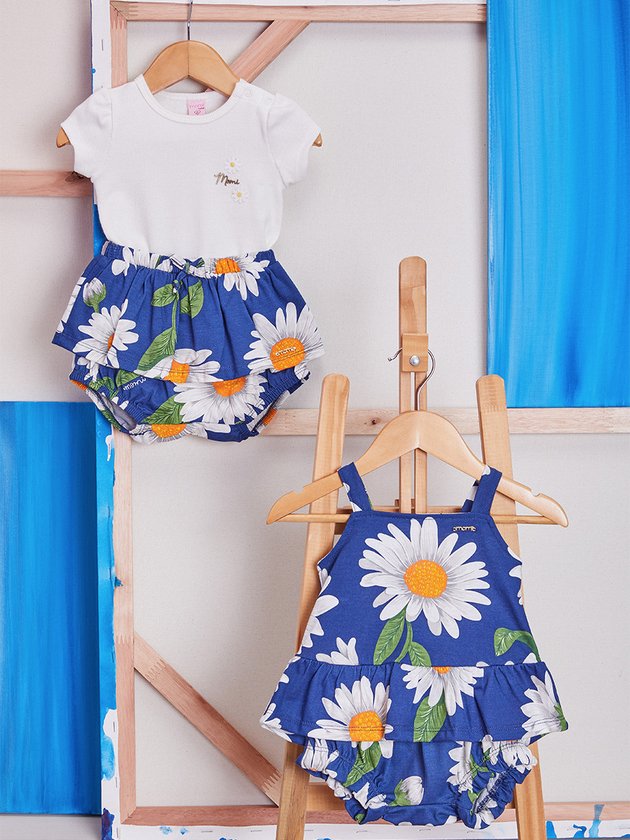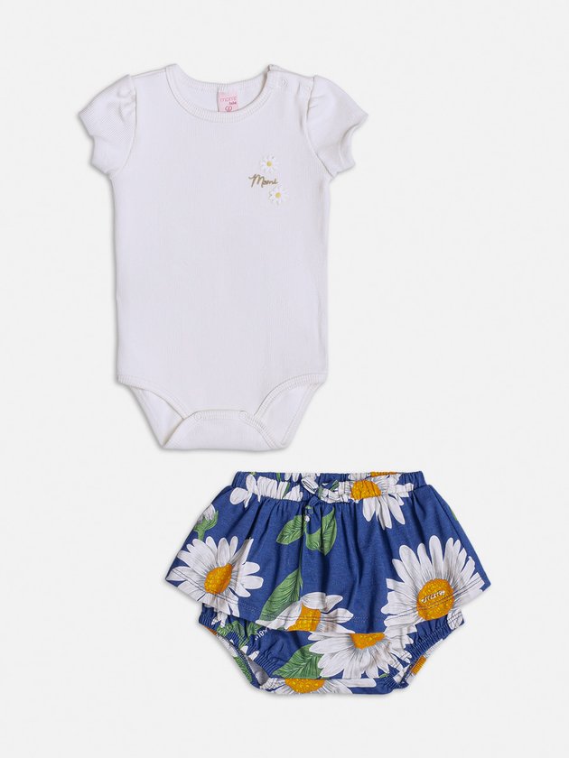 Deixe sua bebê estilosa com o conjunto off white e azul marinho da Momi. O body possui fechamento prático de botões de pressão e um adorável patch personalizado no busto, já o short conta com acabamento em elástico proporcionando conforto ao vestir. O print de margaridas traz um toque delicado e único da marca. Um conjunto perfeito para deixar sua pequena fashion nos dias mais quentes. Composição - Body: 98% algodão e 2% elastano. Short: 100% algodão. Ref.: C1969