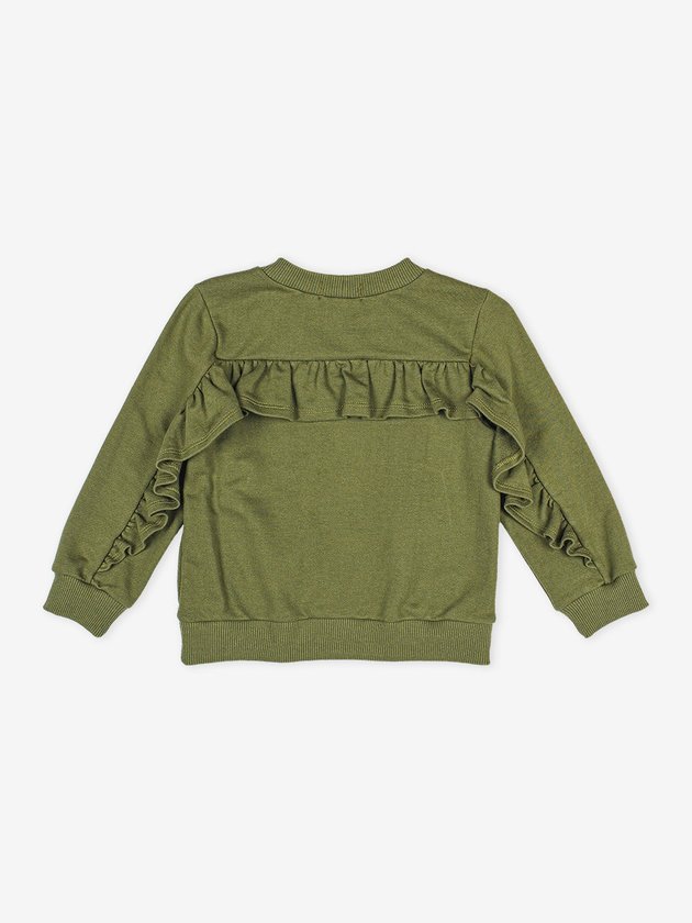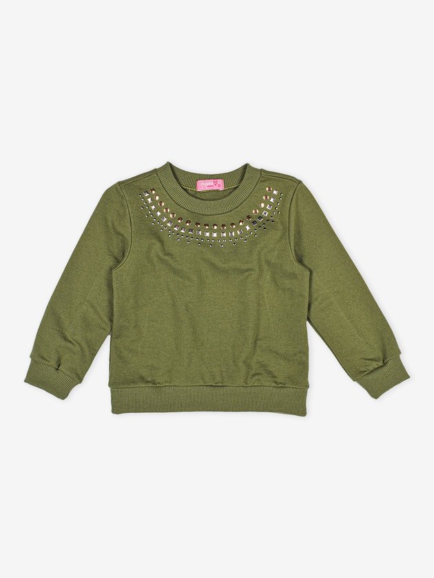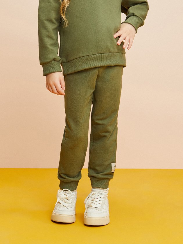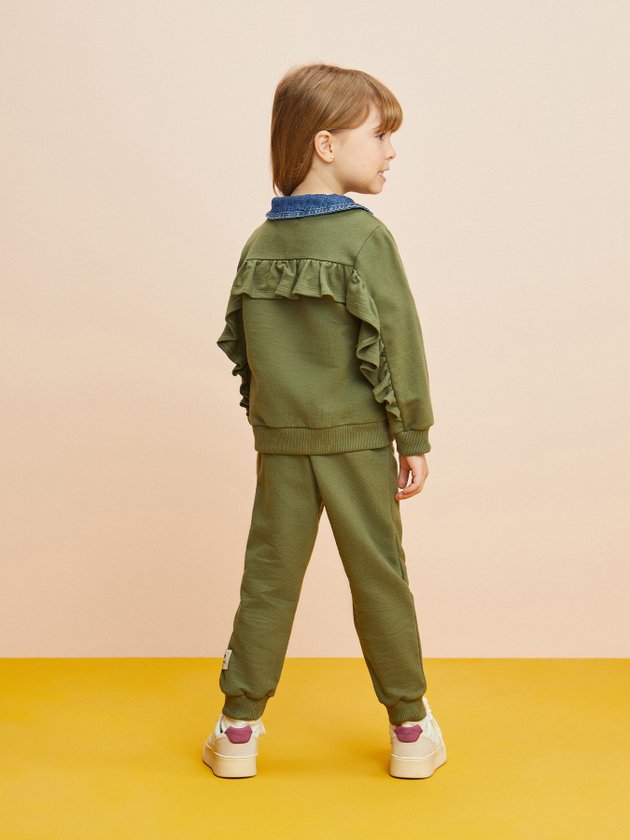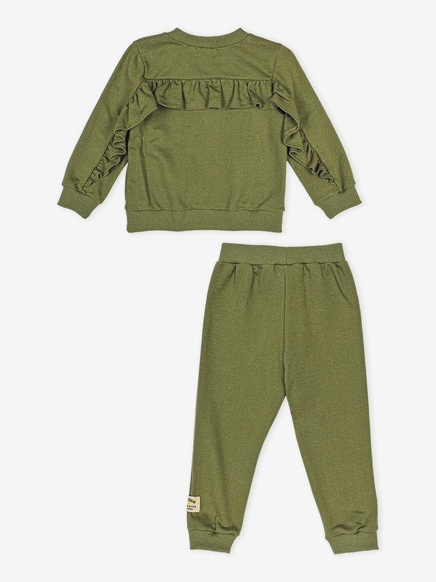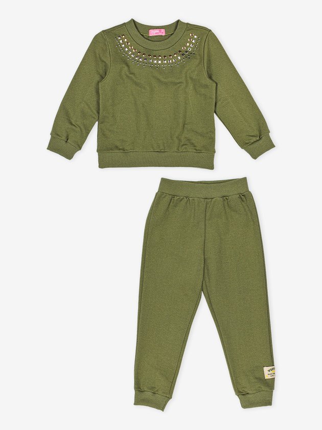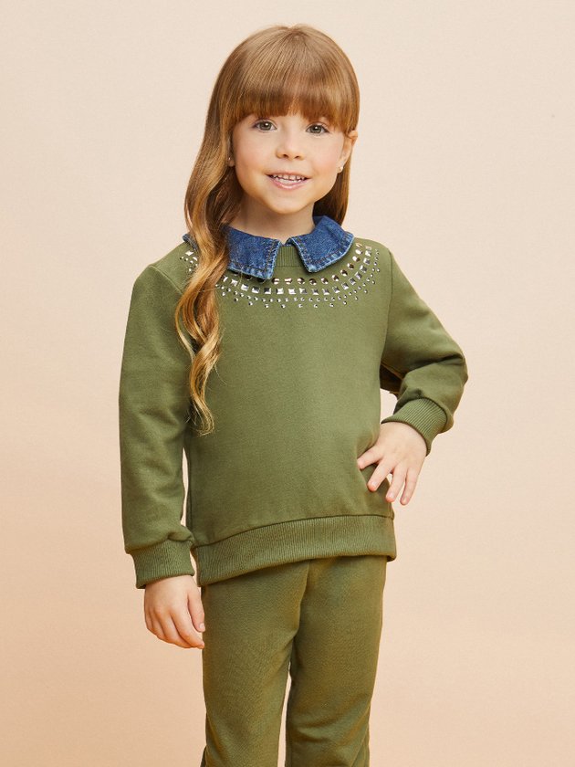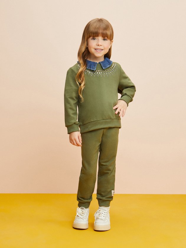 Confeccionado no conforto do moletom verde, o conjunto infantil Momi traz tachinhas na parte frontal e recorte com babado atrás, o elástico na cintura da calça aumenta a praticidade da peça e a etiqueta decorativa personalizada da marca finaliza o look com ainda mais autenticidade. Além do conforto especial que o look traz, ele vai deixar as meninas super quentinhas. Composição: 100% algodão. Ref.: J5135
