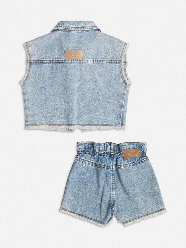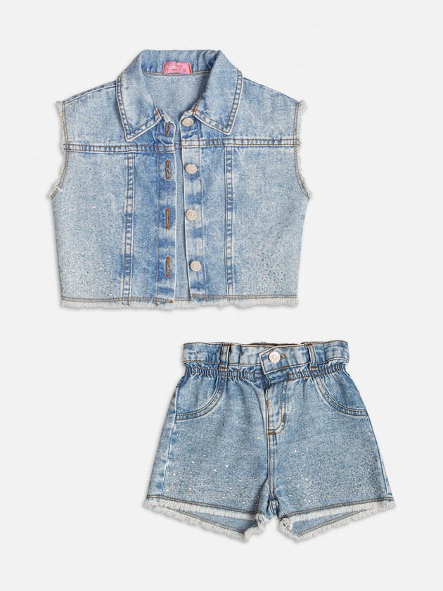 Este conjunto jeans com colete e short é a escolha perfeita para um look estiloso e cheio de atitude. O colete (J5203) apresenta botões frontais, acabamento desfiado e aplicações de strass na parte inferior, trazendo um toque de brilho moderno e delicado. O short jeans (J5165) complementa o visual com sua cintura elástica para conforto, acabamento desfiado na barra e detalhes em strass na frente, adicionando charme e personalidade à peça. Um conjunto versátil e ideal para eventos casuais e momentos de diversão com estilo. Ref.: J5795