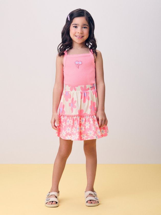 Regata: 49% Poliéster, 47% Algodão e 4% Elastano; Saia: 85% Algodão no mínimo