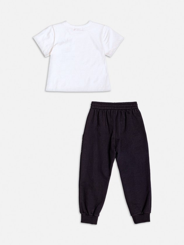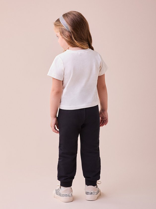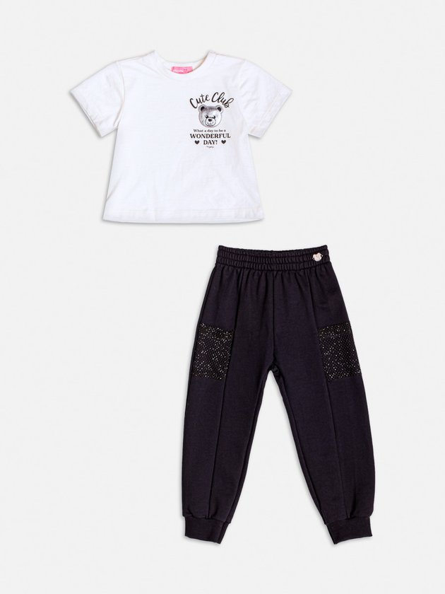 Moderno e estiloso, esse conjunto traz uma blusa branca com a frase "Cute Club" e detalhes fofos, enquanto a calça preta com aplicações brilhantes nos bolsos adiciona um toque fashion. Confortável e cheio de atitude, ideal para ocasiões casuais e especiais.