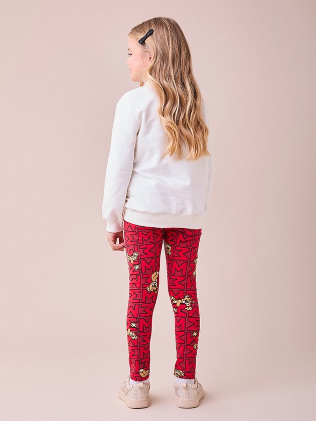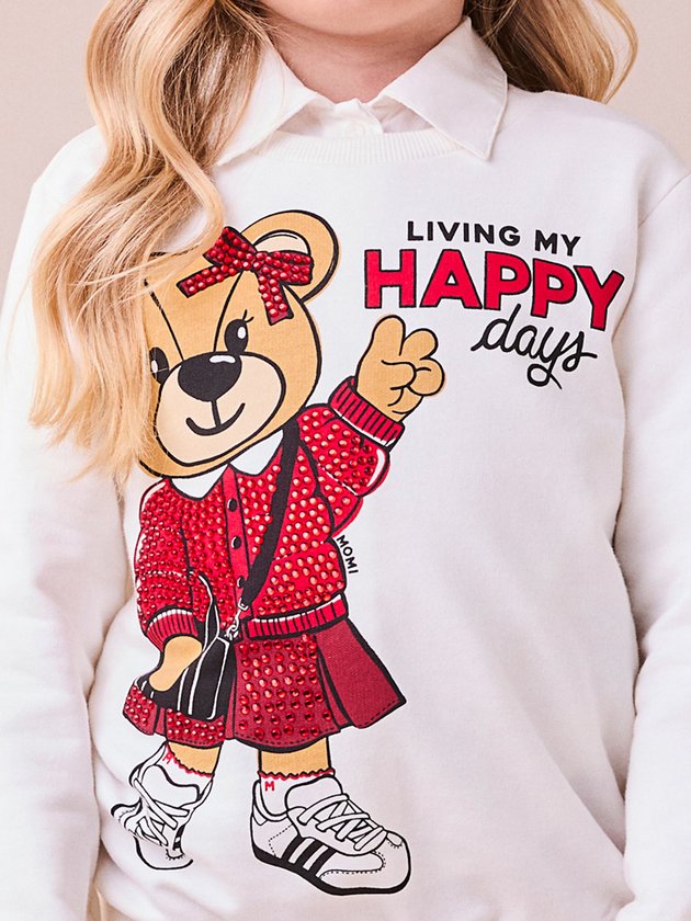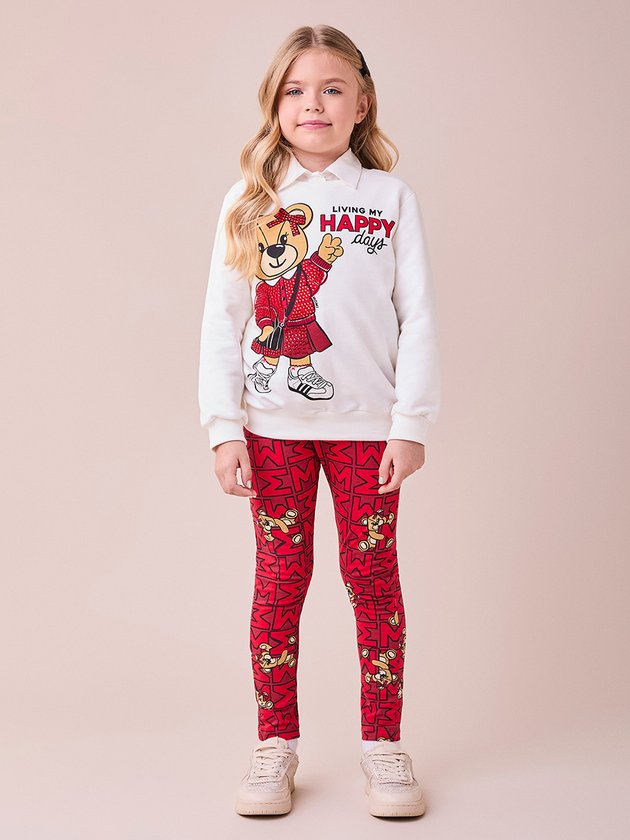 Para um dia cheio de conforto e estilo, o casaco off white com detalhes em strass e estampa de ursinhos se destaca, combinado com a calça vermelha superdivertida.