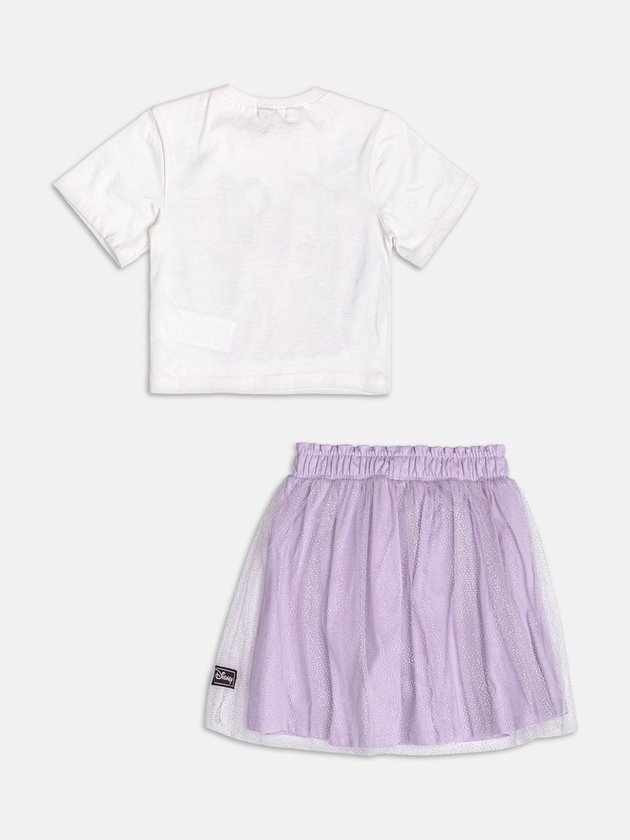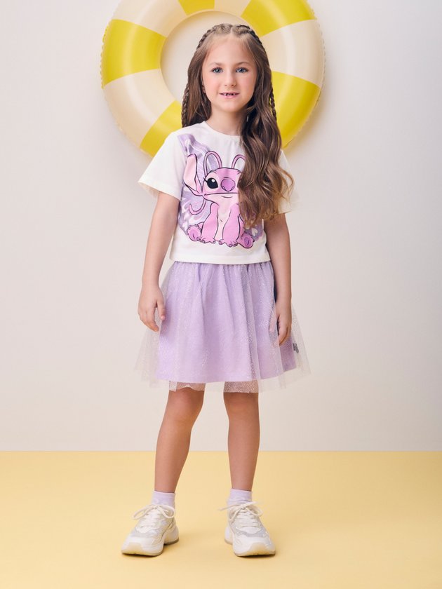 Encantador e super delicado, esse conjunto traz a estampa da Angel com asas de borboleta em tons roxos e aplicação de glitter, criando um efeito mágico e cheio de personalidade. A saia em camadas de tule brilhoso adiciona movimento, volume e aquele toque lúdico que transforma qualquer momento em algo especial. Um look perfeito para quem ama brilho, leveza e muito charme!