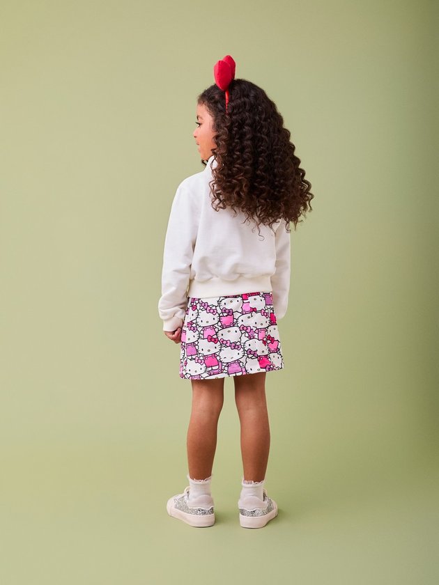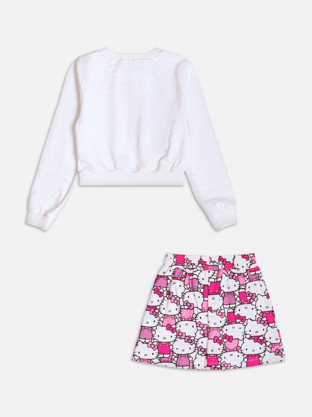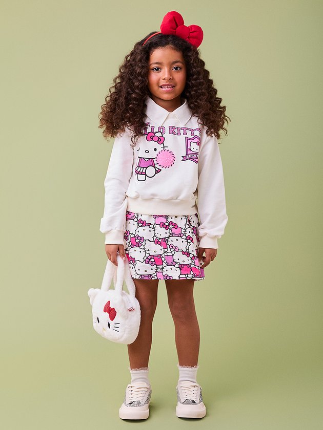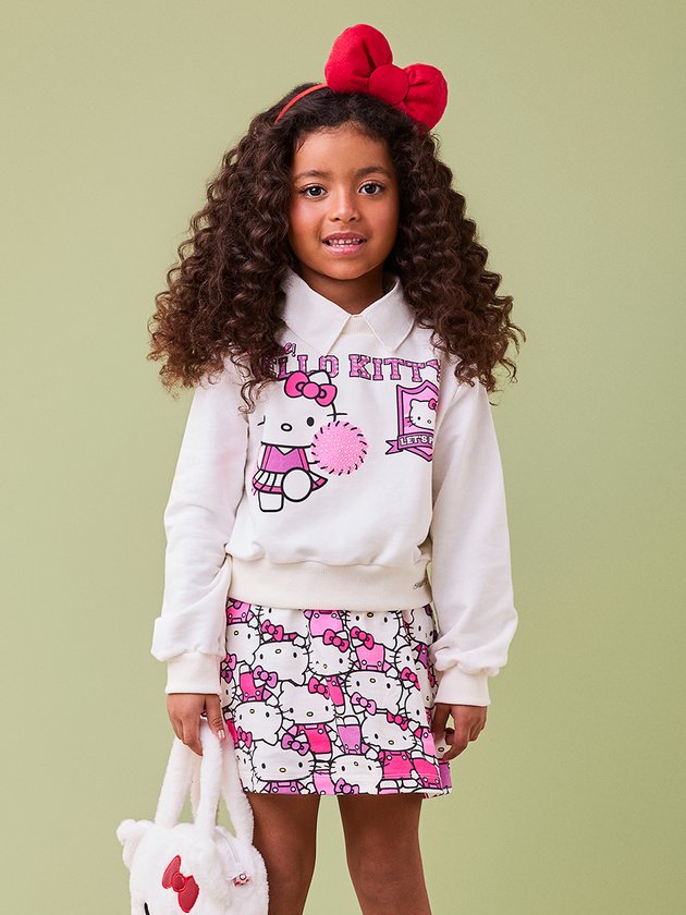 Este conjunto encantador da Hello Kitty é composto por uma blusa branca de manga longa com estampa da personagem em sua versão animada como cheerleader, com pompons brilhantes, acompanhada de uma saia rodada com a mesma estampa divertida da Hello Kitty em diferentes poses. Um patch delicado na blusa e o design vibrante nas cores rosa e lilás tornam a peça perfeita para um look descontraído e cheio de estilo, ideal para as fãs da personagem.