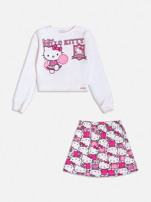 Este conjunto encantador da Hello Kitty é composto por uma blusa branca de manga longa com estampa da personagem em sua versão animada como cheerleader, com pompons brilhantes, acompanhada de uma saia rodada com a mesma estampa divertida da Hello Kitty em diferentes poses. Um patch delicado na blusa e o design vibrante nas cores rosa e lilás tornam a peça perfeita para um look descontraído e cheio de estilo, ideal para as fãs da personagem. *Não acompanha golinha. Ref.: H6542