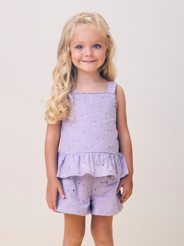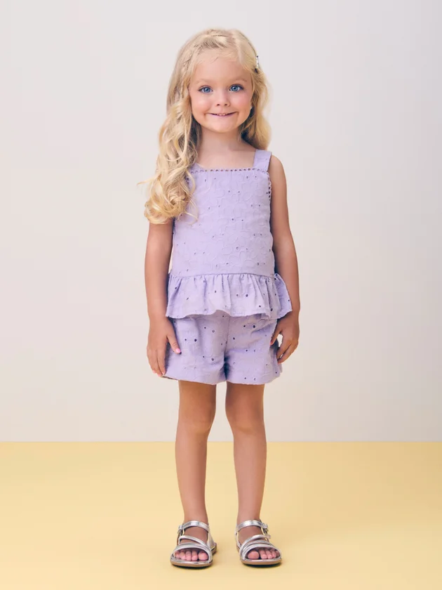 Romântico e cheio de charme! A blusa em laise lilás ganha ainda mais graça com babados aplicados no decote e nas mangas, enquanto o short em tom coordenado traz modelagem soltinha e cós elástico, garantindo conforto e delicadeza. Um look leve, fresco e encantador para os dias quentes.