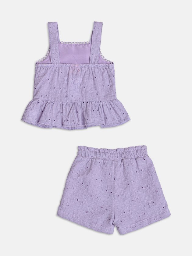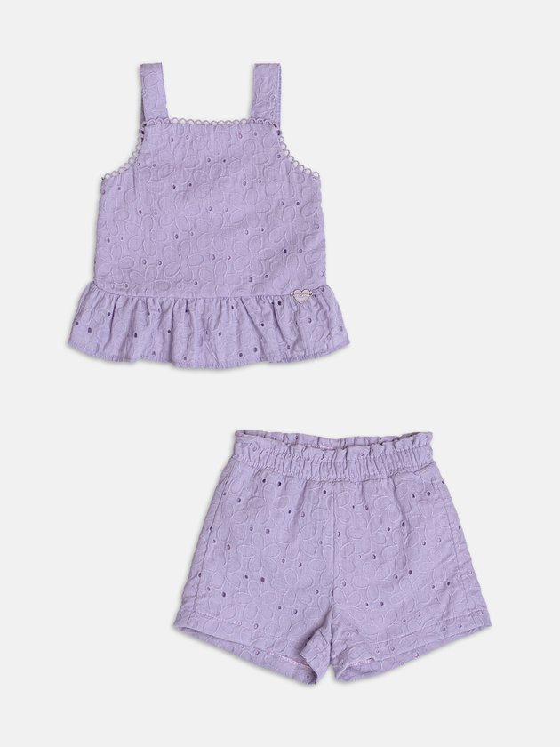 Romântico e cheio de charme! A blusa em laise lilás ganha ainda mais graça com babados aplicados no decote e nas mangas, enquanto o short em tom coordenado traz modelagem soltinha e cós elástico, garantindo conforto e delicadeza. Um look leve, fresco e encantador para os dias quentes. Ref.: J6894