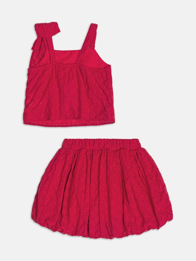 Elegante e cheio de atitude, esse conjunto em laise vermelho chama atenção pelos detalhes sofisticados. A blusa traz um laço delicado na alça e textura rendada que valoriza o visual. A saia balonê segue a mesma proposta romântica com acabamento impecável. A cor intensa traduz a vibração da estação, enquanto os recortes conferem modernidade. Um look especial para ocasiões que pedem presença e delicadeza ao mesmo tempo.