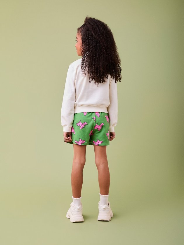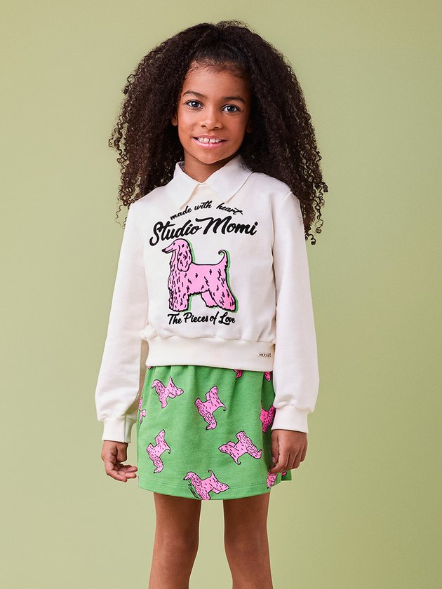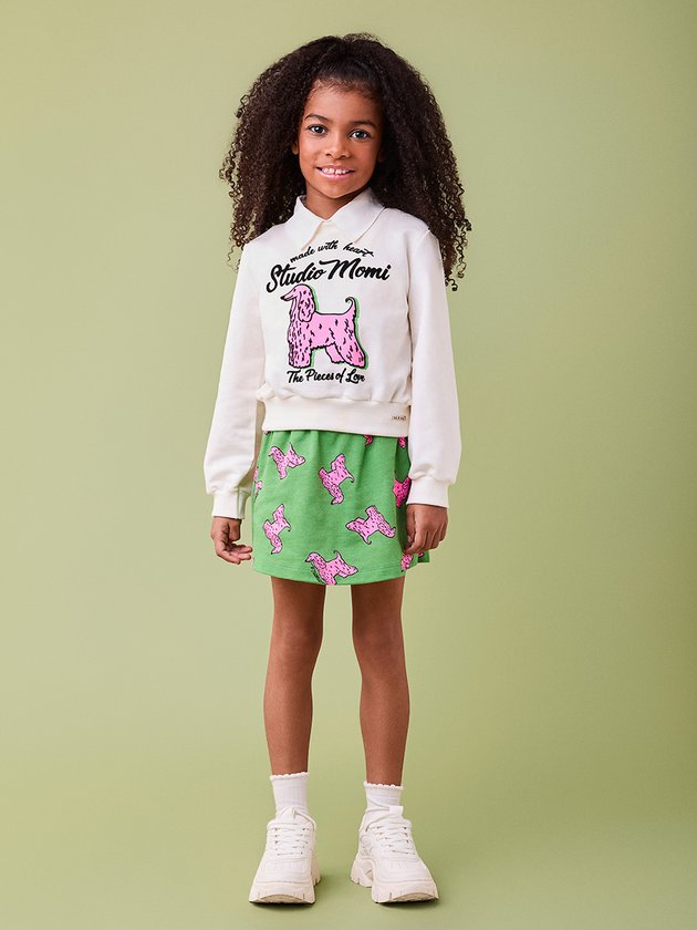 Este conjunto é perfeito para um look confortável e cheio de estilo. A blusa de moletom off-white traz uma estampa divertida com um cachorro pink, acompanhada de uma saia verde vibrante com a mesma estampa do cachorro, criando um visual moderno e ousado. A combinação de cores e o toque fashionista fazem deste conjunto uma escolha excelente para quem ama um look descontraído e único. *Não acompanha golinha. Ref.: H6553