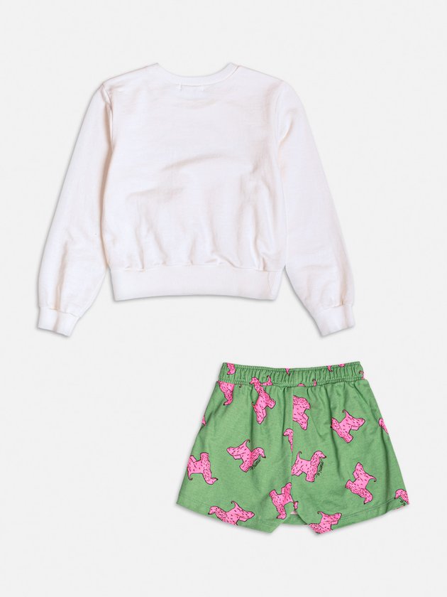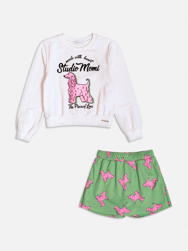 Este conjunto é perfeito para um look confortável e cheio de estilo. A blusa de moletom off-white traz uma estampa divertida com um cachorro pink, acompanhada de uma saia verde vibrante com a mesma estampa do cachorro, criando um visual moderno e ousado. A combinação de cores e o toque fashionista fazem deste conjunto uma escolha excelente para quem ama um look descontraído e único.
