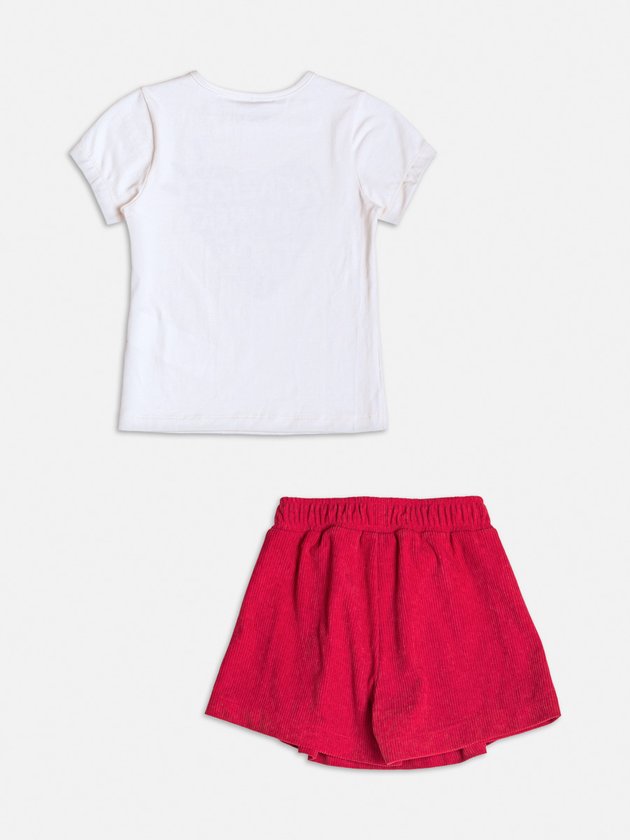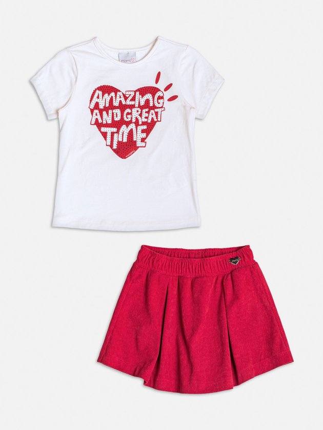 Este combinação perfeita para os dias quentes! Este conjunto traz uma blusa branca de manga curta com a mesma estampa de coração e frase inspiradora em vermelho brilhante. O short saia em veludo vermelho garante charme e conforto, ideal para encontros casuais ou eventos mais descontraídos. Ref.: H6147