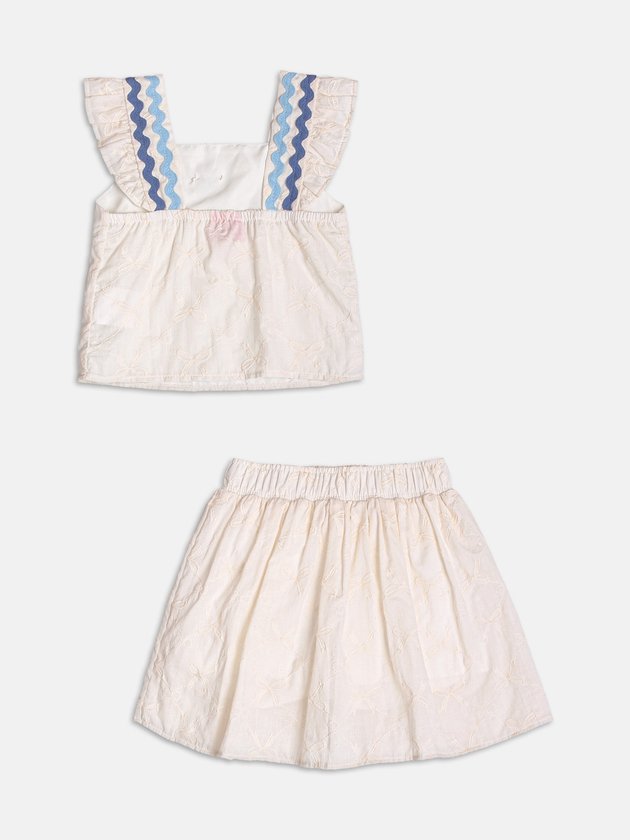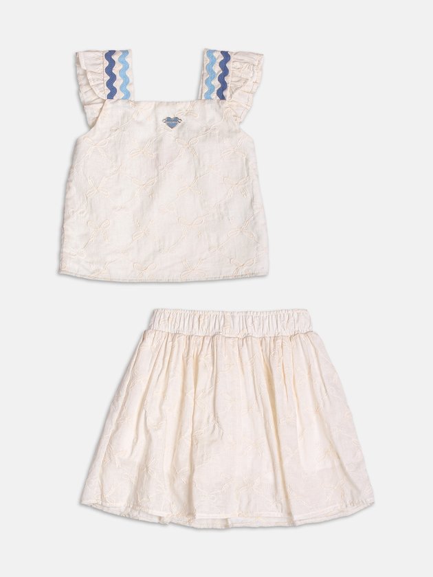 Com tom neutro e detalhes cheios de graça, esse conjunto em laise cinza aposta nas sianinhas aplicadas para trazer textura e charme ao visual. A blusa com mangas curtas e babado delicado conversa com a saia coordenado, criando uma composição elegante e leve. Um look refinado e romântico, perfeito para ocasiões que pedem conforto com estilo.