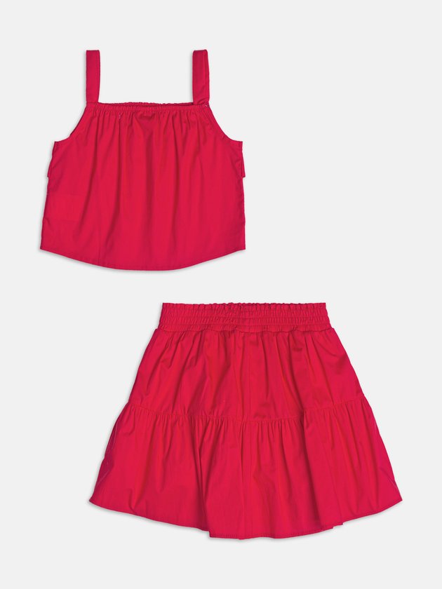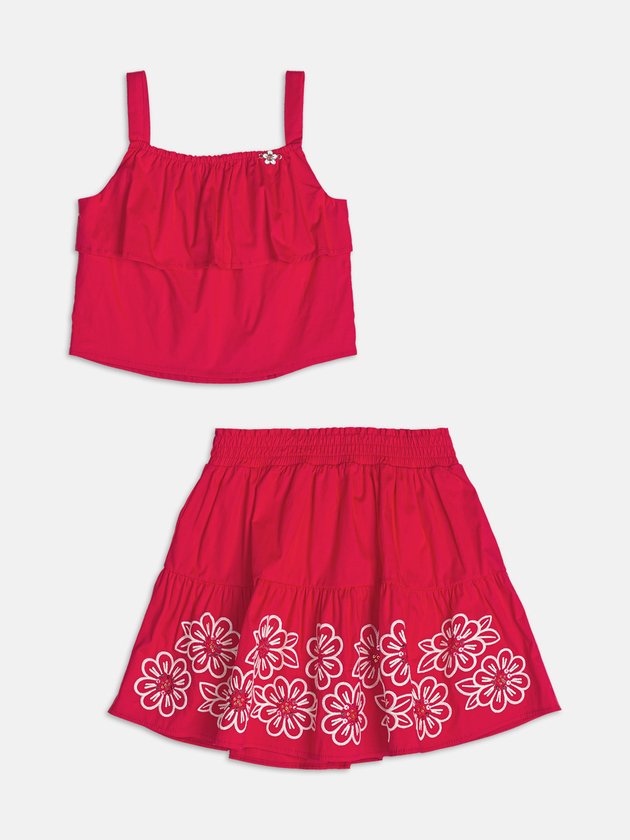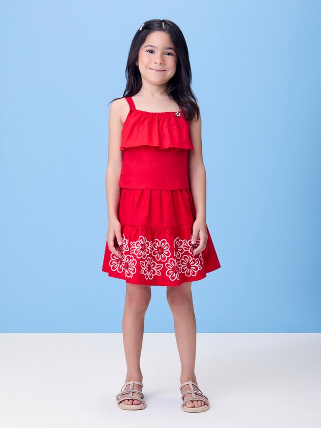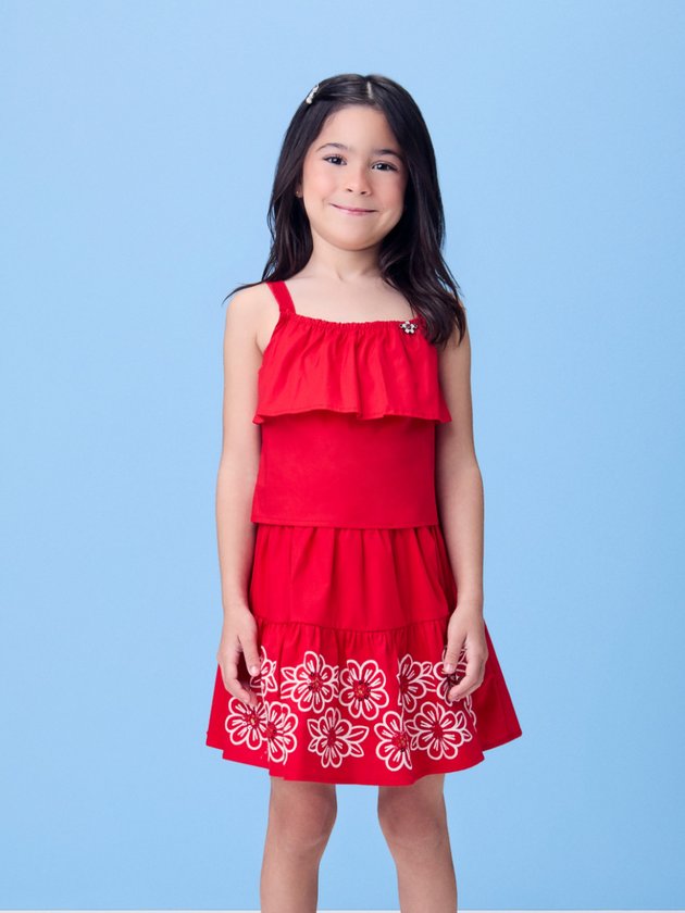 Com uma estética leve e romântica, esse conjunto em tricoline vermelho traz estampa floral delicada em tons que traduzem a suavidade do verão. A blusa com alcinhas e decote reto acompanha detalhes franzidos que valorizam o caimento da peça. A saia com cós ajustável complementa o look com conforto e elegância. O tecido leve e estruturado confere movimento ao visual, ideal para passeios especiais. Um look poético e fresco para brilhar sob o sol.