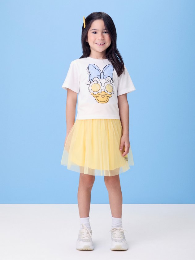 Em tom amarelo vibrante, esse conjunto celebra o verão com leveza e estilo. O tule delicado traz transparência na medida certa, criando movimento e sofisticação ao look. A estampa da Daisy Duck aparece de forma fofa e divertida, em meio ao fundo branco. A combinação entre o tecido leve e a cor alegre resulta em um visual encantador. Uma peça que une o lúdico e o fashion com perfeição.