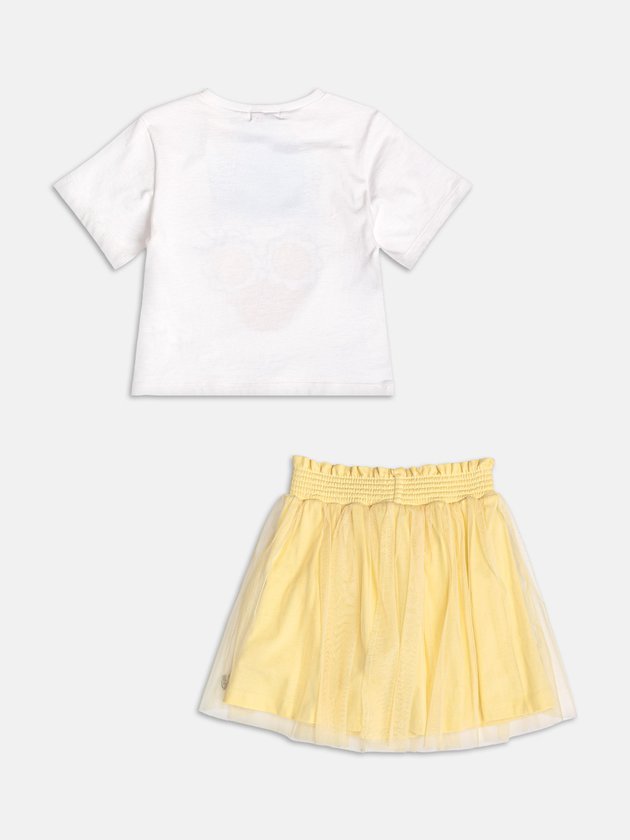 Em tom amarelo vibrante, esse conjunto celebra o verão com leveza e estilo. O tule delicado traz transparência na medida certa, criando movimento e sofisticação ao look. A estampa da Daisy Duck aparece de forma fofa e divertida, em meio ao fundo branco. A combinação entre o tecido leve e a cor alegre resulta em um visual encantador. Uma peça que une o lúdico e o fashion com perfeição. Ref.: H6632