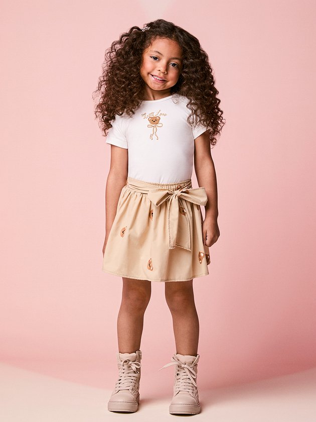 O Conjunto Infantil com Bordado de Ursinho combina delicadeza e estilo em uma produção cheia de charme. A blusa branca possui toque suave e bordado de ursinho que adiciona personalidade ao look, mantendo conforto durante todo o dia. A saia bege complementa com estampa de ursinhos bordados e um laço lateral marcante que valoriza a cintura e deixa tudo ainda mais gracioso. O caimento leve permite movimento natural, ideal para passeios, festas ou momentos especiais. Um conjunto versátil, moderno e fofo, pensado para acompanhar a rotina das pequenas com elegância e praticidade.