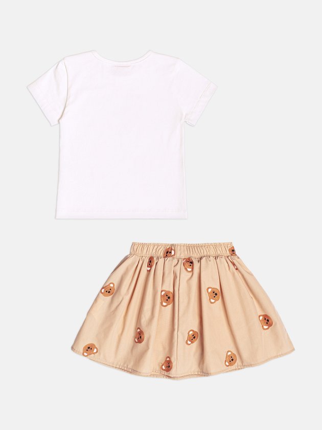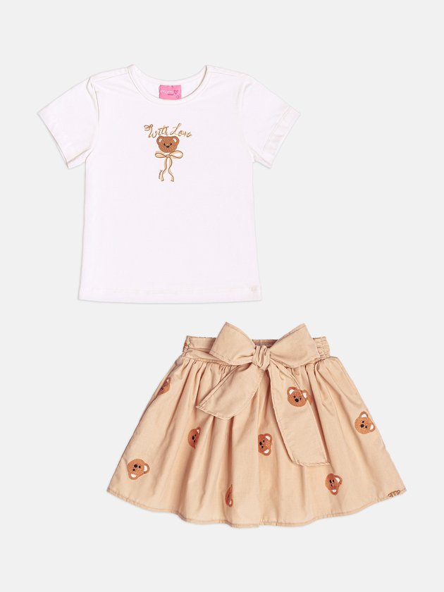 O Conjunto Infantil com Bordado de Ursinho entrega um visual delicado e supermoderno para as pequenas. A blusa branca traz bordado fofo e acabamento macio, enquanto a saia bege com estampa de ursinhos e laço lateral garante charme extra. Confortável, leve e estiloso, é perfeito para ocasiões especiais ou para deixar o dia a dia mais encantador. Ref. J7242