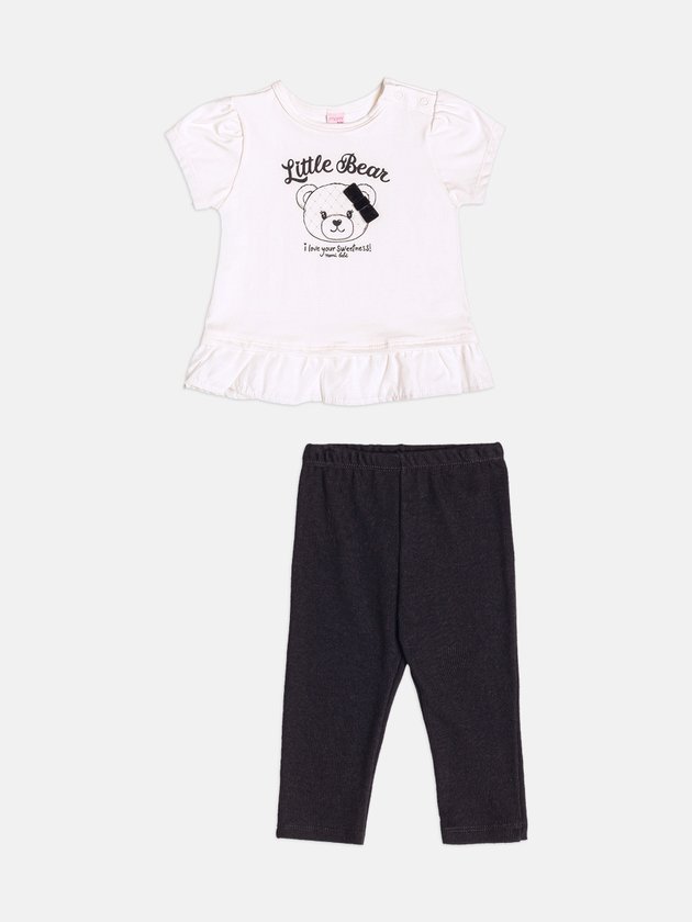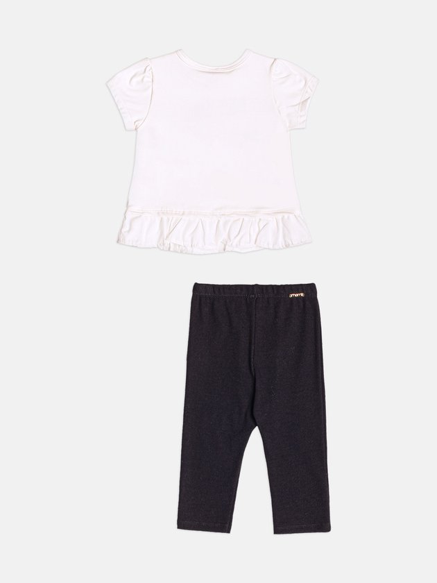 O Conjunto Infantil de Ursinha com Babado Momi encanta com sua delicadeza e conforto. A blusa em malha suave possui estampa de ursinha com laço aplicado e detalhe de babado em tecido leve na barra, que traz movimento e feminilidade ao look. As mangas curtas tornam a peça perfeita para dias mais quentes, mantendo a praticidade com abertura no ombro por botão de pressão. A calça legging, confeccionada em malha confortável, possui cós com elástico funcional que garante ajuste perfeito e liberdade de movimento. Um conjunto versátil, ideal para passeios ou momentos de diversão com estilo e doçura.