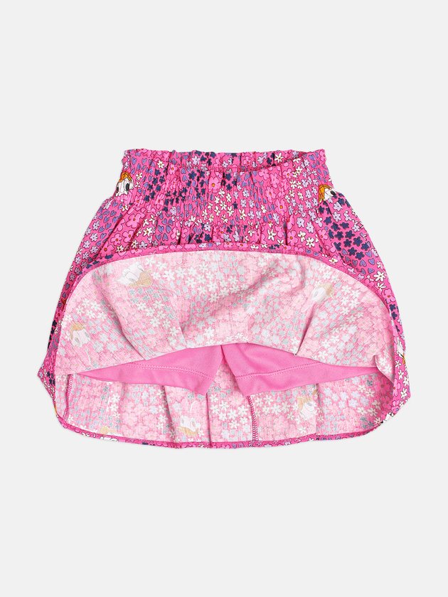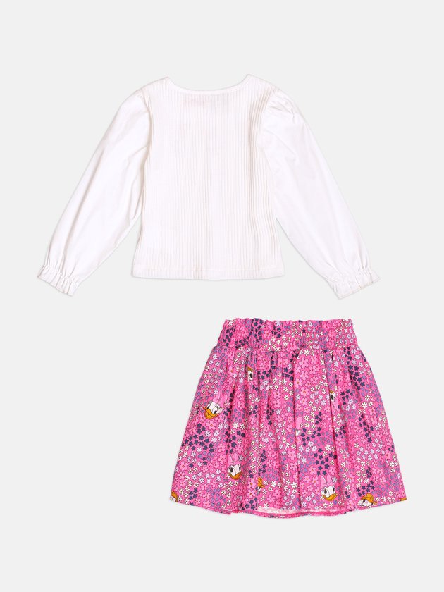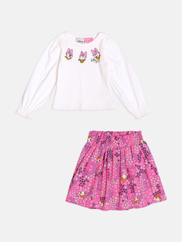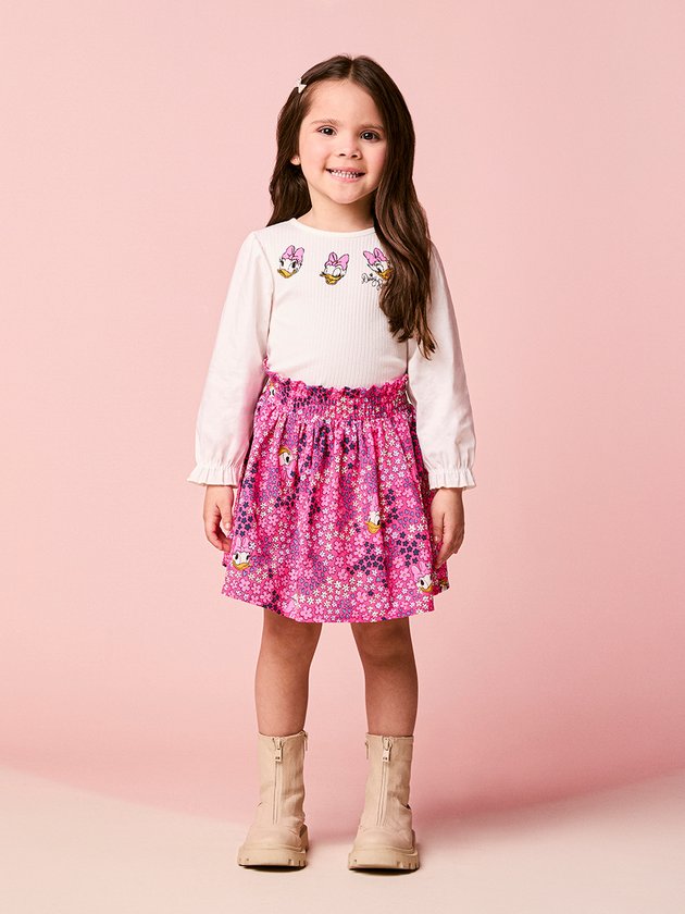 O conjunto infantil manga longa da Daisy Duck chega com aquela vibe fofa e confortável que as pequenas adoram. A blusa branca canelada tem textura suave, caimento soltinho e estampa da Daisy em três versões superexpressivas, garantindo charme imediato. As mangas longas trazem elasticidade no punho, deixando tudo ainda mais delicado. Já a saia pink estampada é cheia de flores coloridas e mini ilustrações da personagem, criando um visual vibrante e divertido. O tecido leve e o elástico na cintura garantem liberdade total para brincar, passear e curtir o dia. É o conjunto perfeito para looks práticos, estilosos e com aquele toque mágico da Disney.