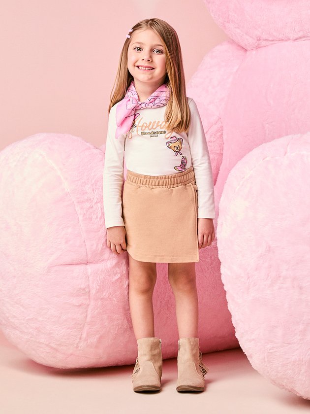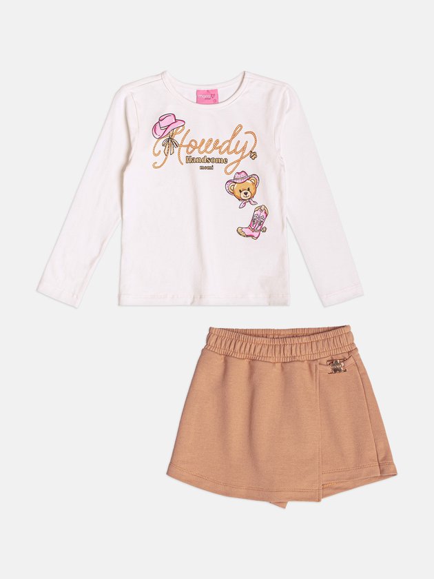 O Conjunto Infantil Manga Longa de Ursinha Cowgirl foi criado para meninas que amam conforto com um toque de personalidade. A blusa off-white apresenta estampa charmosa da ursinha cowgirl e detalhe brilhante no lettering, trazendo aquele visual lúdico e delicado. O short-saia caramelo completa o look com um caimento suave, cós confortável e aplique dourado que adiciona estilo sem exagero. Feito para permitir movimento livre, o conjunto é ideal para passeios, escola ou momentos especiais, garantindo sempre praticidade e um visual fofo. Uma peça versátil, moderna e cheia de identidade para o dia a dia.